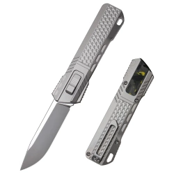 RT-Sharp Leopard Titanium, Manual Fine Grinding Pearlescent/Manual Wire Drawing compact EDC folder from the young Remette Knives manufactory. OTF with a blade that extends due to the force of gravity. Titanium Handle with innovative blade release system.