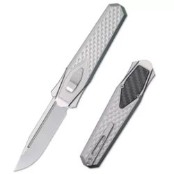 Swordfish Titanium / Carbon Fiber, Pearlescent. An innovative knife from the young Remette Knives manufactory. OTF with an extendable blade made of Böhler M390 steel by gravity. Handle made of titanium with an smart blade release system.