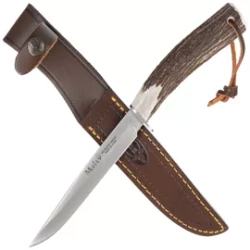 Gredos 14 is a hunting knife. The blade was covered non-reflective (Satin Finish) coat. Handles cladding from deer antler. Double-sided steel. Leather case sewn on the edges with decorative thread with embossed logo Spanish Muela Company.