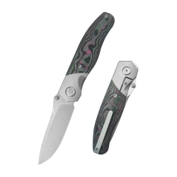 Velvet Snake Grey Titanium/Watermelon Sugar Camo Carbon, Stonewashed compact EDC folder from Bastards Knives studio. Blade made of high-quality Bohler M390 steel, handle made of titanium and carbon fiber. Secure and safe liner lock.