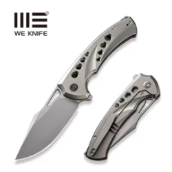 Swiftfin Gray Titanium, Polished Bead Blasted, a large EDC folding knife from the WE Knife manufactory. Wide head made of CPM 20CV steel, ergonomic handle milled from titanium. Excellent whole hand grip and two ways of opening.