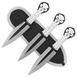 Skulls Set 3 pcs White Cord, Satin 3Cr13Mov - a set of dart throwing knives with full tang construction, made of stainless steel and wrapped in white paracord. Comes with a nylon carrying sheath with compartments.