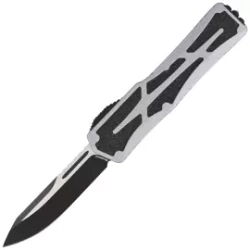 Colossus Single Edge Gray Aluminum, Cerakote Two-Tone Black Magnacut. Automatic OTF knife operating in D/A (Double Action) mode with a slider to extend and retract the blade. Customised version by Anthony Marfione Jr., owner of Heretic Knives!