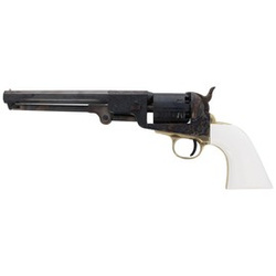 1851 Navy Yank Steel Frame rewolwer czarnoprochowy Samuela Colta kal .36. Bęben z wygrawerowaną sceną zwycięstwa II Texas Navy w bitwie pod Campeche. Hartowana ogniowo stalowa rama. Kabłąk, okucia chwytu z polerowanego mosiądzu. Okładziny drewno orzechowe