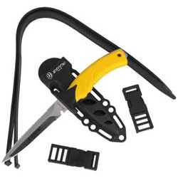 TORPEDO11 BE YELLOW, doskonały nóż nurkowy (back-up) firmy MAC. Nieodzowny element wyposażenia każdej wyprawy nurkowej. Głownia dagger ze stali nierdzewnej W 1.4116 o dużej odporności na korozję, pokryta nierefleksyjną powłoką IDROGLIDER GOLD® Black.