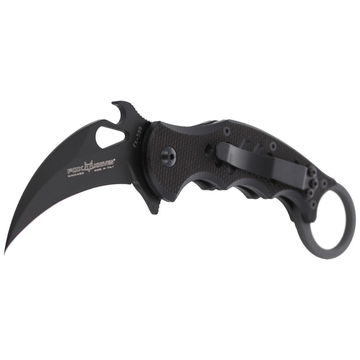 - The FX-599 folder by FOX shows how much traditional Asian karambit knives have evolved. Covered coated Idroglider Black, blade made of Hawkbill N690Co steel, Clip Tip-Up type, three quick release systems, Emerson hook, flipper and oval cutout.