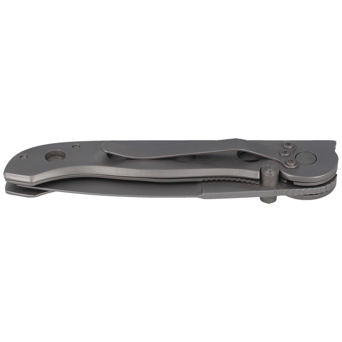 Handle - profiled, covered with matt aluminum cladding. Weight reduction was achieved by using holes on the cover surface. The folder is equipped with a single-position metal clip screwed with torx screws that allows you to move the knife in the tip-down position.