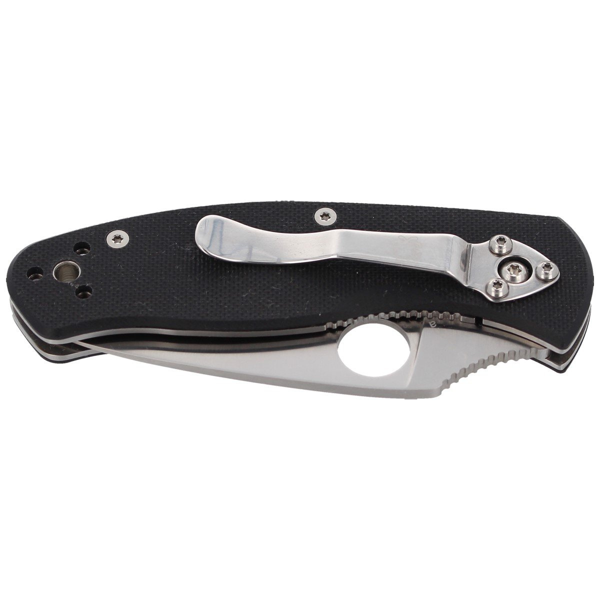 Handle - profiled, covered with non-slip textured in black color. Made of material G-10 (durable, resistant to high and low temperatures, chemicals). The cut in one of the covers guarantees intuitive access with the right hand to cut the SpyderHole and to release the blockade of the Liner-Lock blade, Michael Walker. The folder is equipped with a metal screw clip with the possibility of mounting in four planes (up / down, right / left). 4-way clip positions. In the rear part of the handle, was placed gap (lanyard hole) enabling the installation of a security cable.