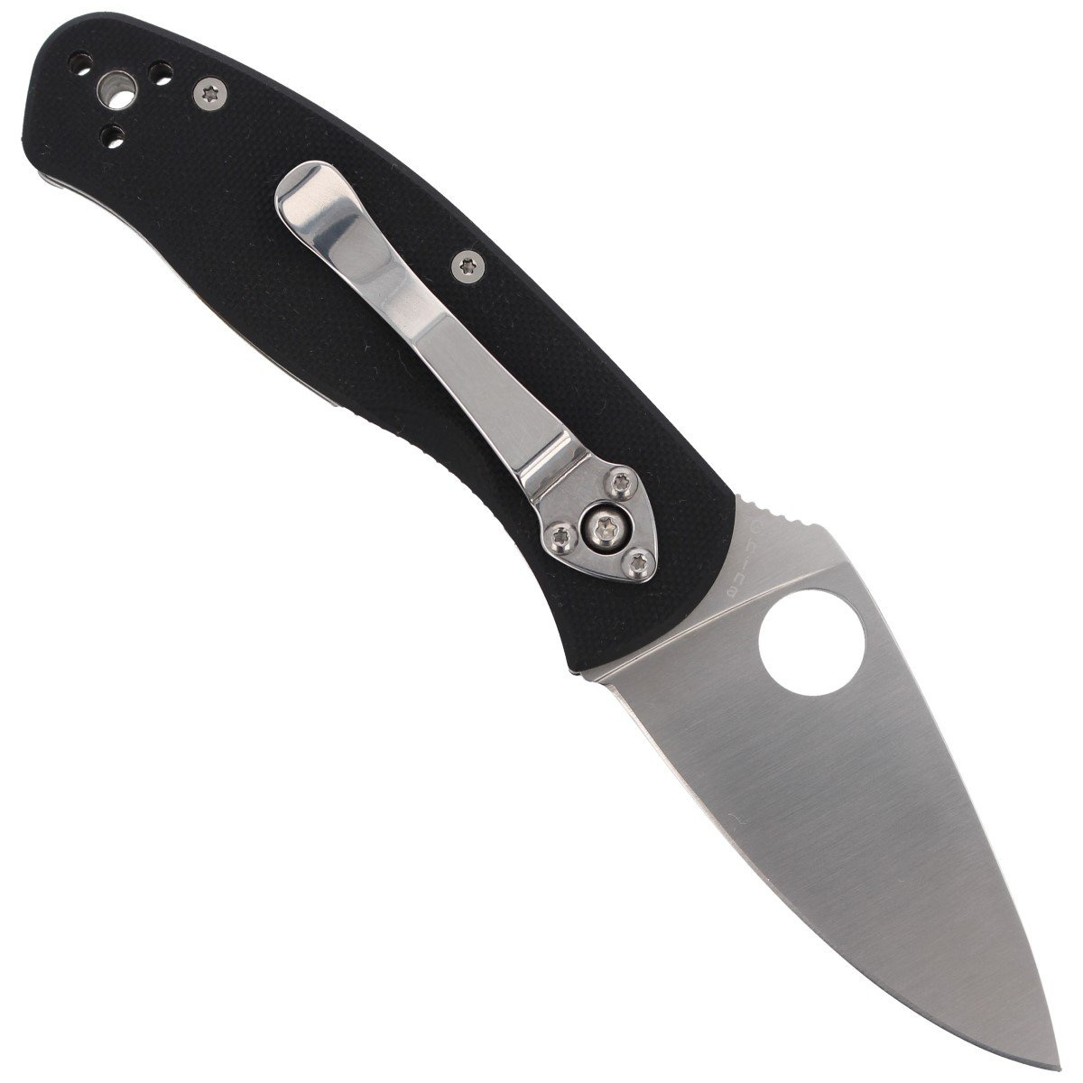 Blade - 3.1 mm thickness with Drop Point profile, provides excellent cutting edge geometry at low friction. The cutting edge was made with a Full Flat Grind cut. Smooth blade (Plain type) extends over the entire length of the blade, enabling powerful cuts with the blade heel. The blade is made of 8Cr13MoV sharp stainless steel (equivalent to Japanese AUS-8 steel). Careful placement of a 14 mm round SpyderHole cut-out on the blade (Spyderco patent) places the hand in the right place for intuitive opening of the blade and at the same time increases the support hinge under the choil jimping thumb.
