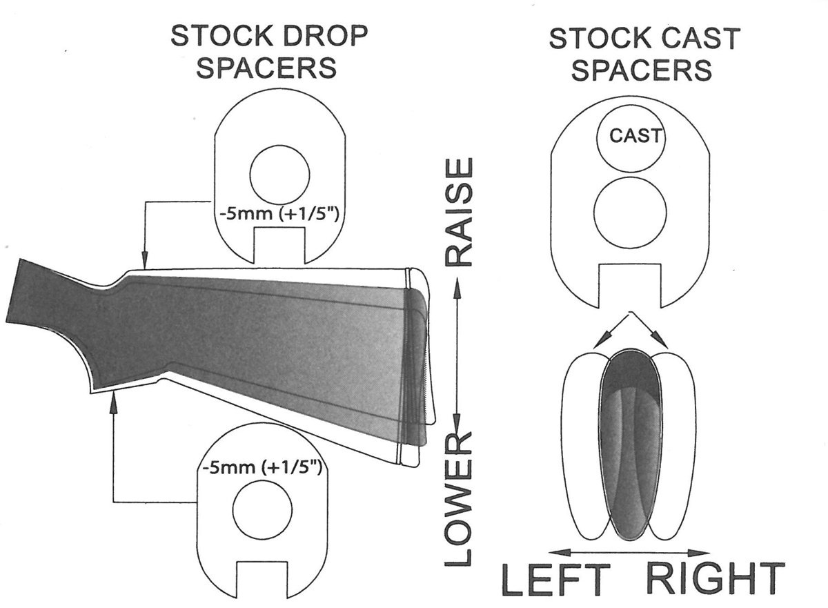 Spacers - allow you to adjust the angle of the stock in two planes. Thanks to the four spacers included in the set, the process of adapting the shotgun to your needs is quick and uncomplicated. It is enough to insert appropriately shaped spacers between the breech chamber and the stock to configure the shotgun according to your preferences and shooting style.