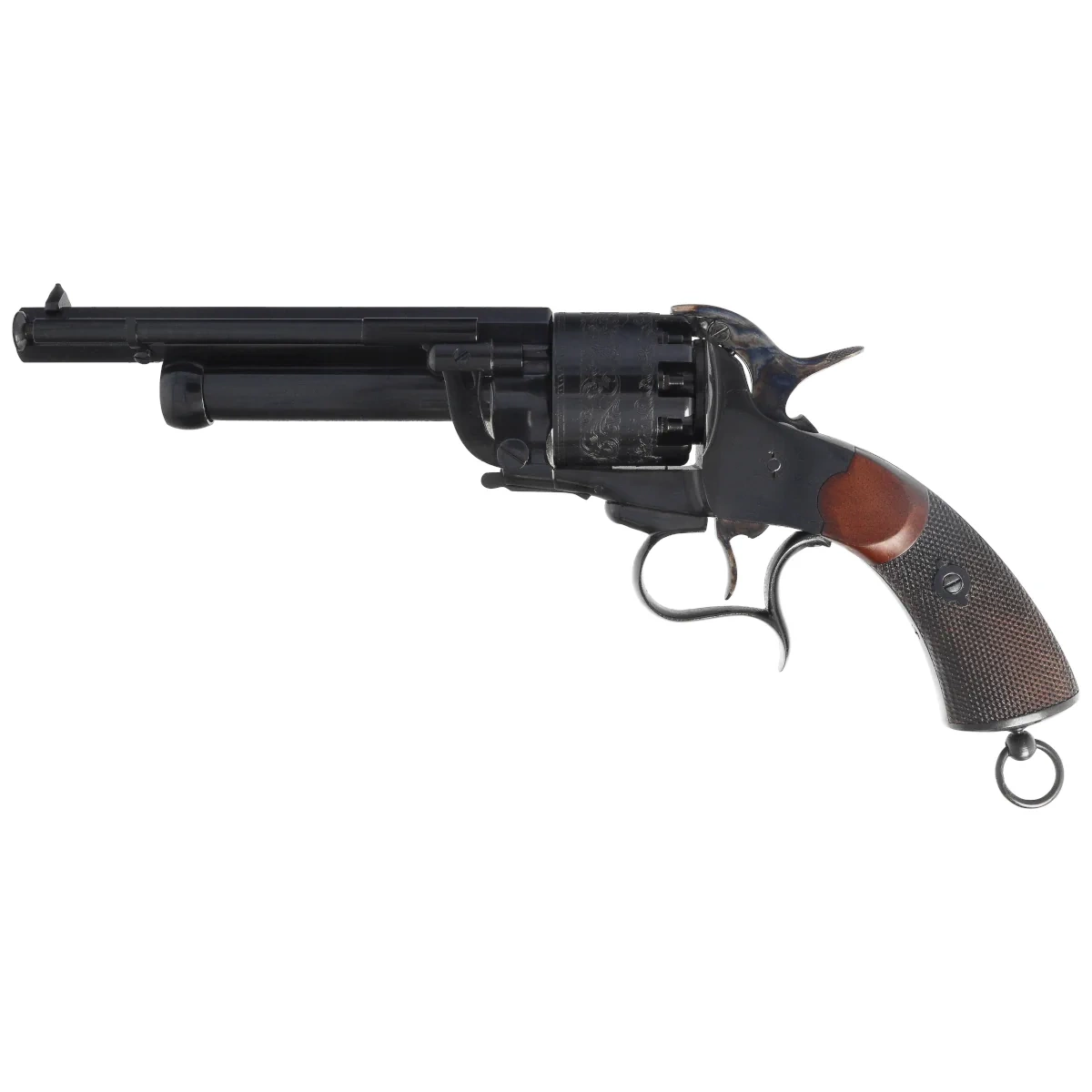 This is a muzzle-loading, percussion cap black powder revolver. It was patented in 1856 in the United States by French firearms designer and aristocrat Jean François Le Mat. The Cavalry version features a spur trigger guard for improved grip, a lever-secured barrel attachment to the frame, and a lanyard ring for secure retention.