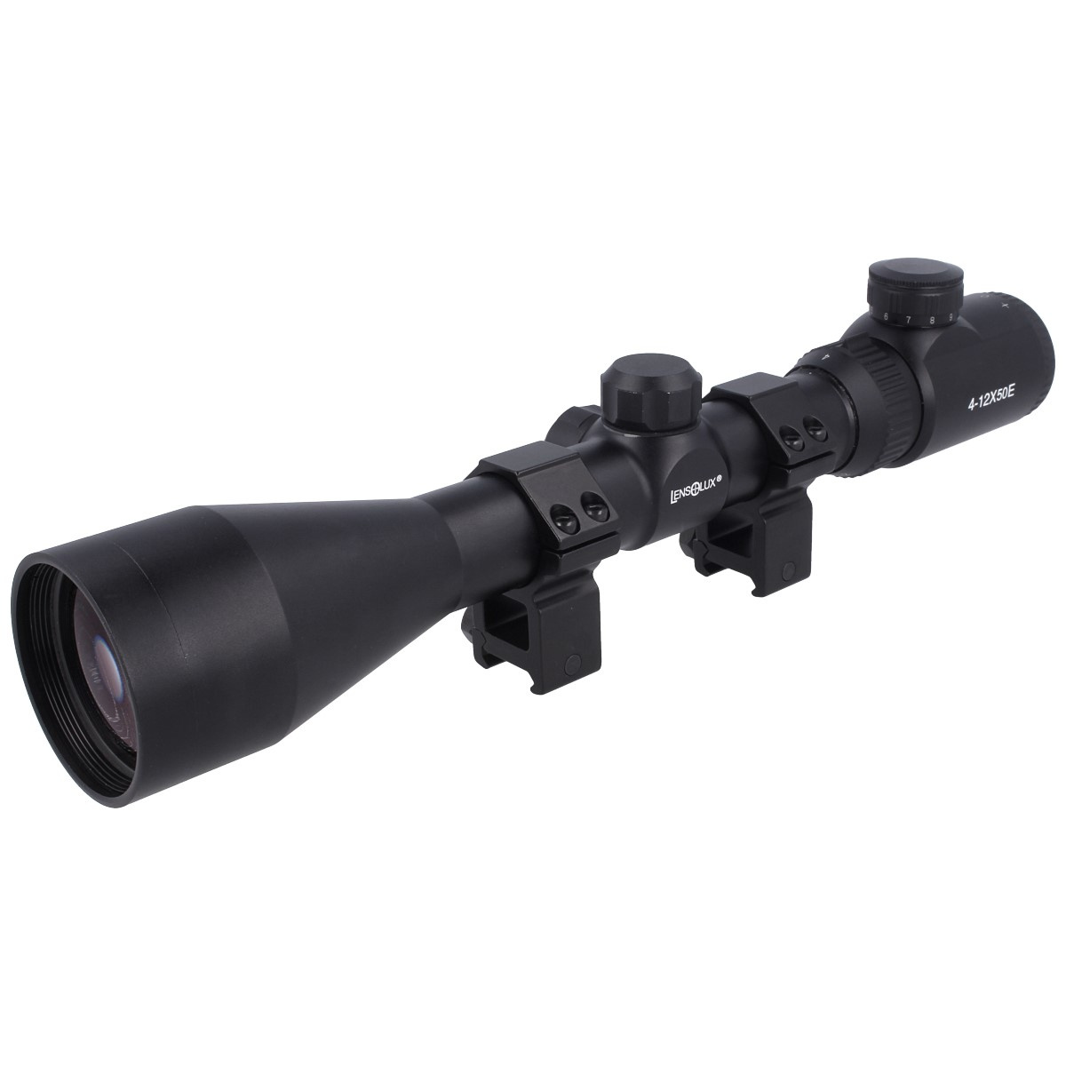 - 19435 a new generation rifle scope with illuminated 4 Red-Dot crosshair by Lensolux. Variable magnification 3-12x, lens diameter 50mm. Viewfinder with excellent twilight performance and for aiming at smaller targets at longer distances