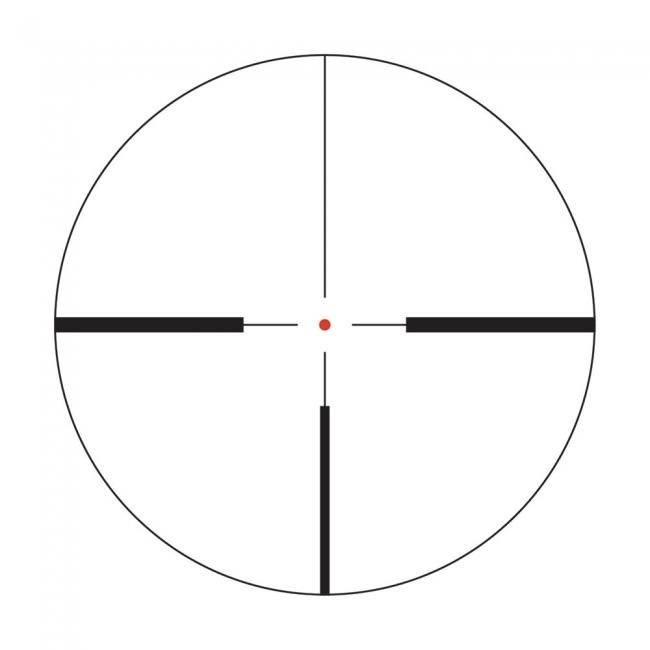 Siatka celownicza - składa się z nie zasłaniającego celu cienkiego krzyża numer 4, trzech grubszych belek oraz z centralnie podświetlanego na czerwono punktu Red Dot z 11 stopniową regulacją jasności. Rozmiar siatki pozostaje zawsze taki sam, pomoże namierzyć cel nawet w warunkach szczątkowego oświetlenia. Jeden z najbardziej popularnych krzyży używanych w celownikach optycznych.