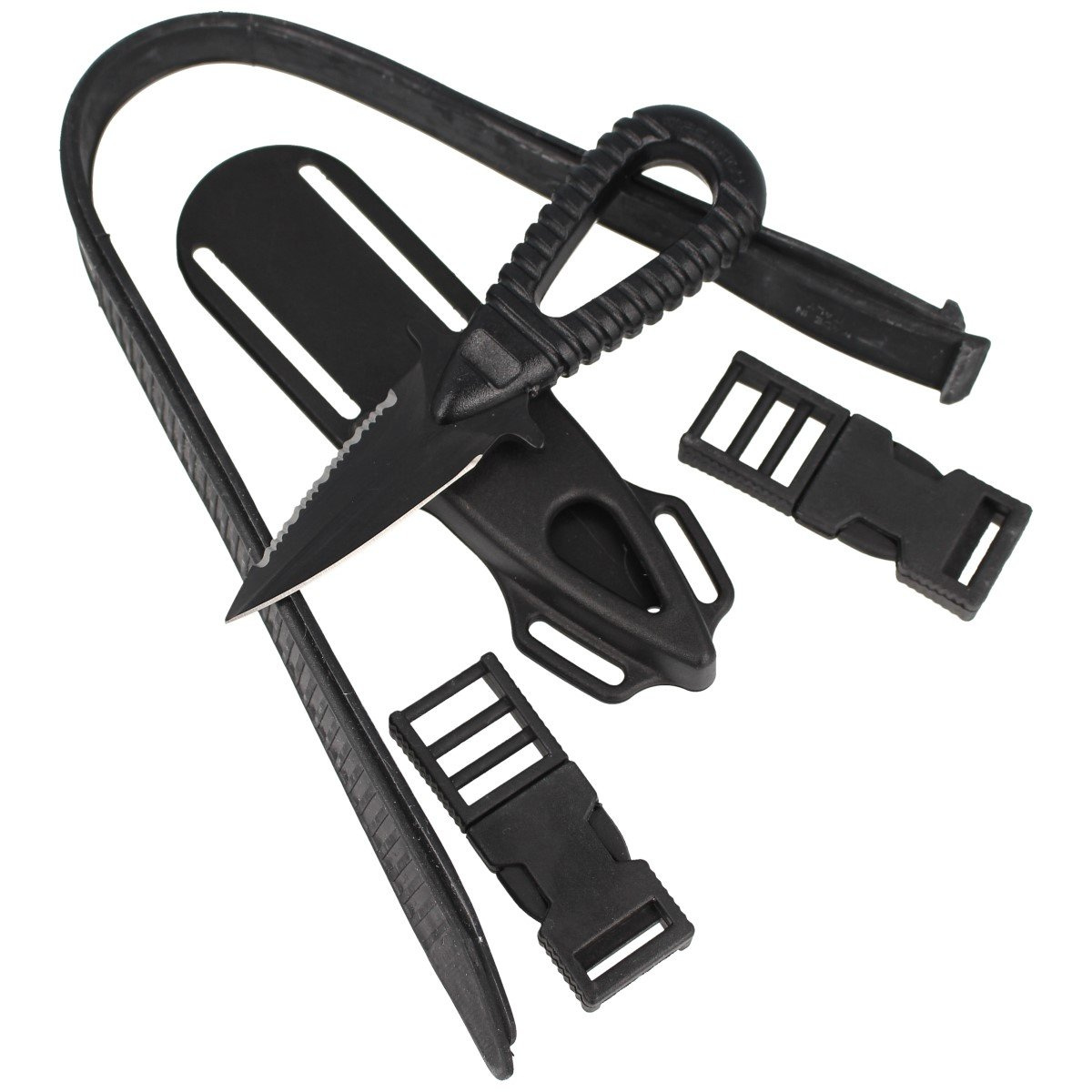 Sheath - made of hard PP polymer with holes for drainage of water, moisture. The holster is equipped with a latch to prevent the knife from slipping out in water. The sheath comes with two rubber straps and 2 plastic buckles for attaching the case to the hand, leg or to a vest.