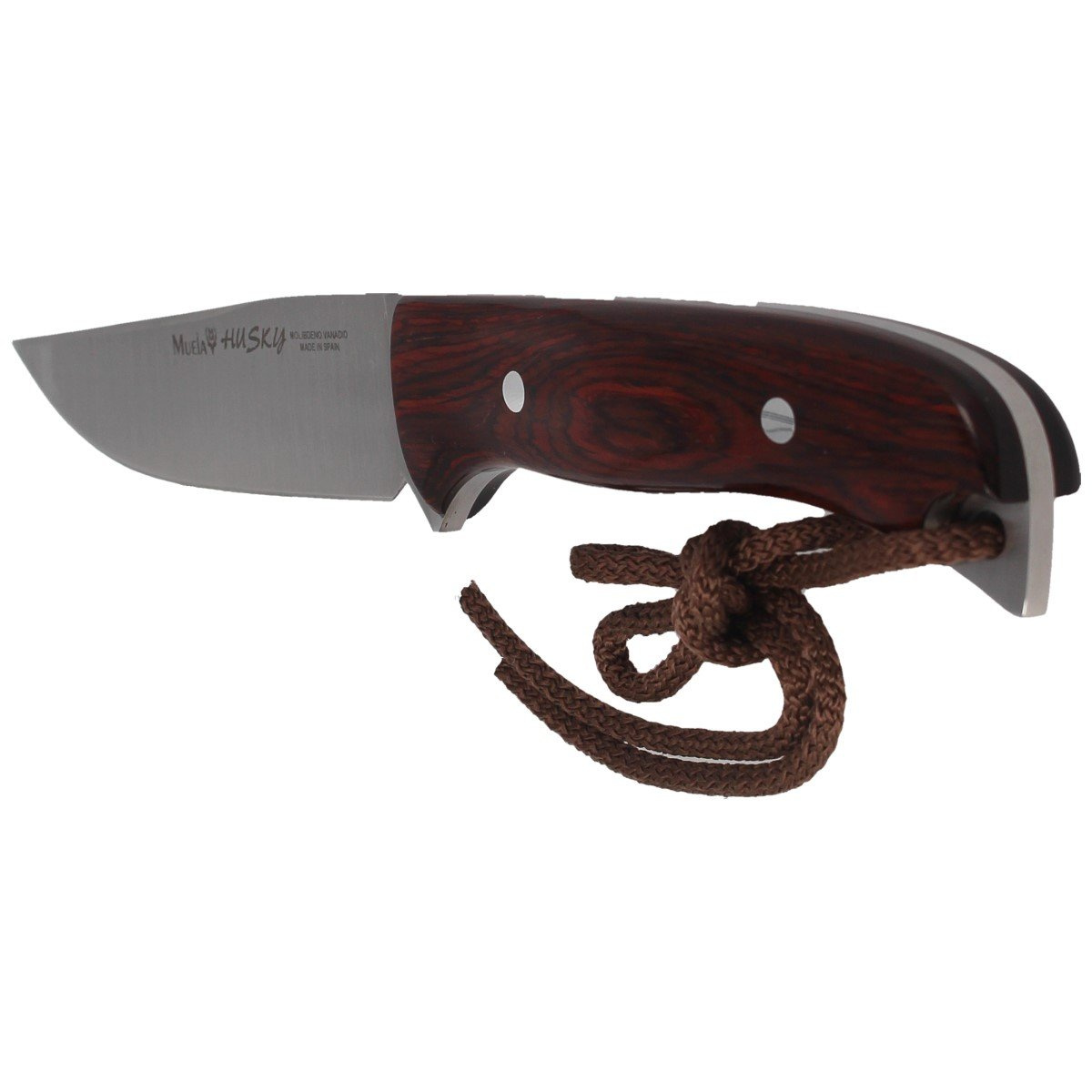- HUSKY-10R, universal Muela knife with fixed full tang blade. Modified Bowie blade made of X50CrMoV15 molybdenum-vanadium steel hardened in the range of 57-58 HRC. Cladding from exotic hard rosewood. A steel head with a rope protects it.
