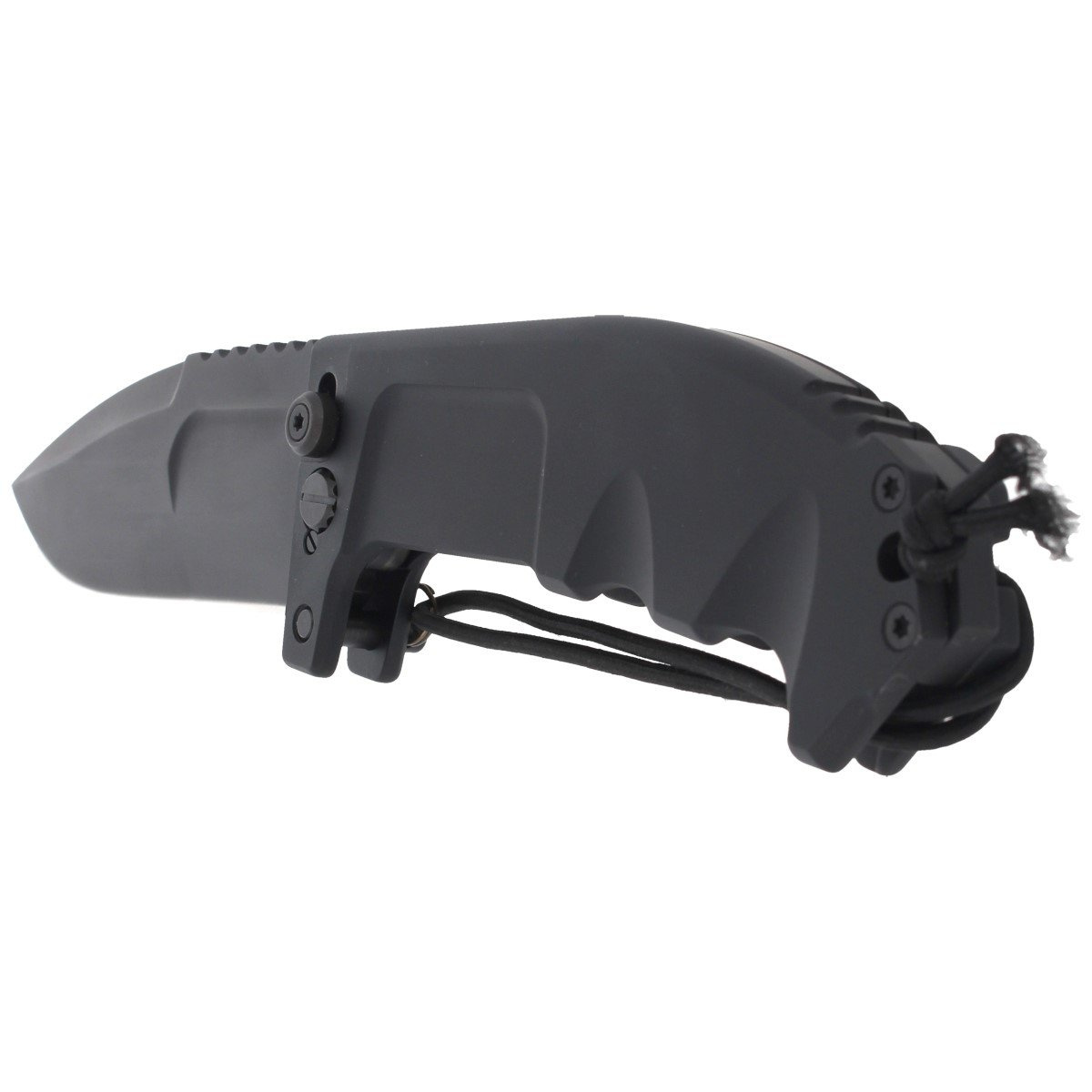 Handle - full-sized, as in ER combat knives. The anodized aluminum scales ensure a secure grip, even with wet hands or when wearing gloves. The handle features full stainless steel liners. At the rear, there is a lanyard hole with an attached flexible cord with a steel pin attached. Additional spine jimping on the handle’s back provides extra grip for users who prefer a reverse hold. Steel head can perform the function of glass breaker and more...
