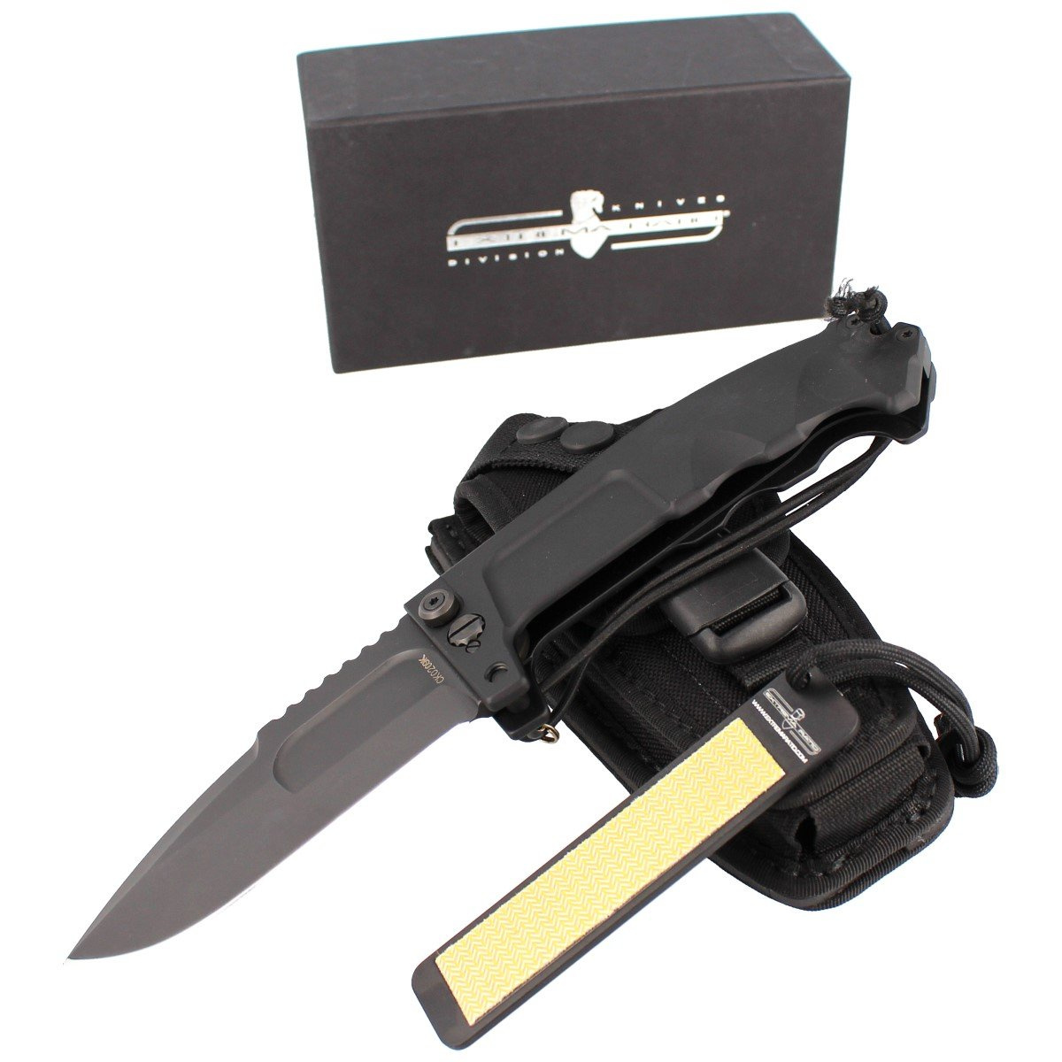 Sheath - multifunctional, made from abrasion-resistant, waterproof black nylon. It features a DuraFlex buckle closure. The sheath allows for carrying the folded folder or with the blade open, as a fixed-blade knife, on a belt or gear/vest using M.O.L.L.E. system straps. It also includes an additional pocket for carrying a diamond sharpener.