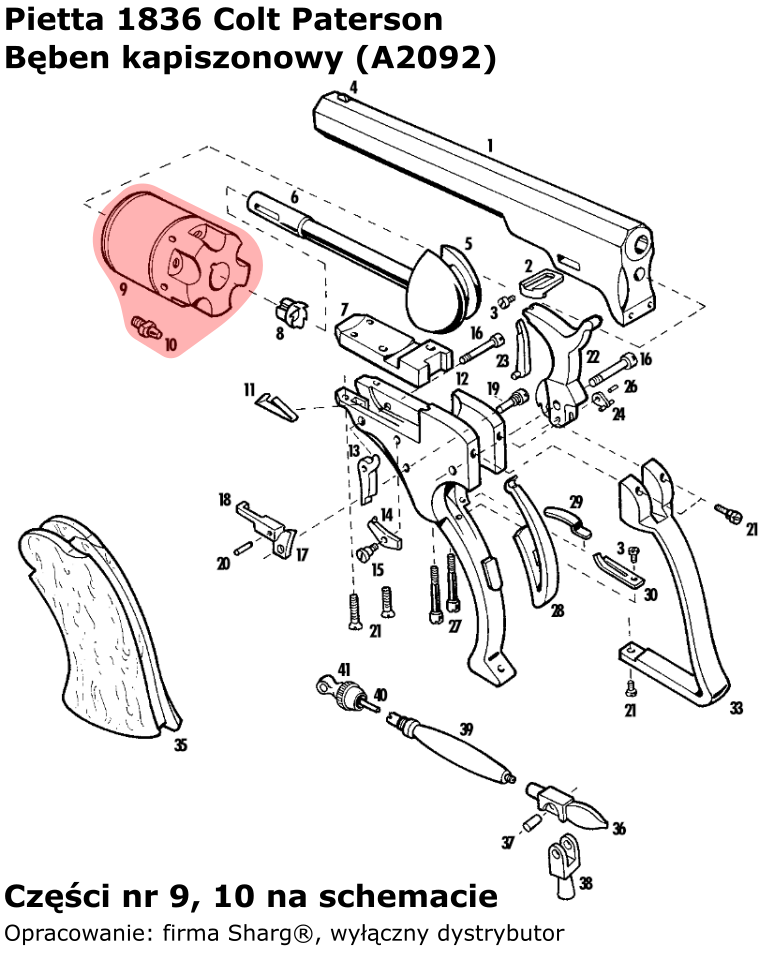 - A2092, a full 5-chamber Pietta percussion drum for the 1836 Colt Paterson Texas black powder revolver, cal. 36. Black oxidized with a stagecoach scene engraved on the drum cylinder. The set includes a set of 5 fireplaces.