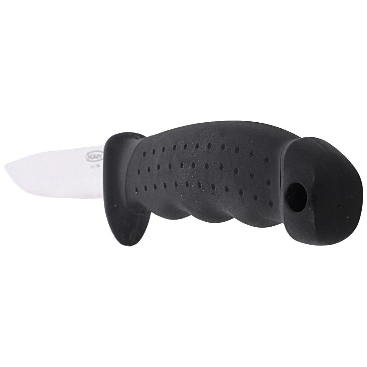 Handle - in black color, moisture-resistant, made of hardened plastic covered with non-slip pattern, provides a comfortable, secure grip. Despite its relatively small size, the knife lies securely even in large hands. The rounded shape of the head prevents the hand from slipping during operation.