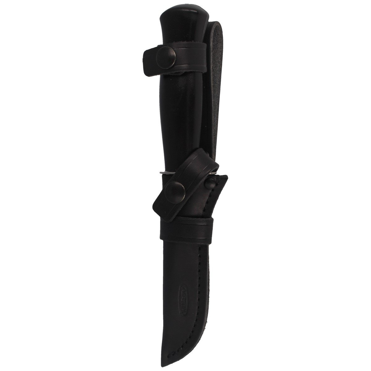 Black leather case with two snap fasteners. Mounting to belt or equipment allows you to carry the knife in the scabbard in an upright position.
