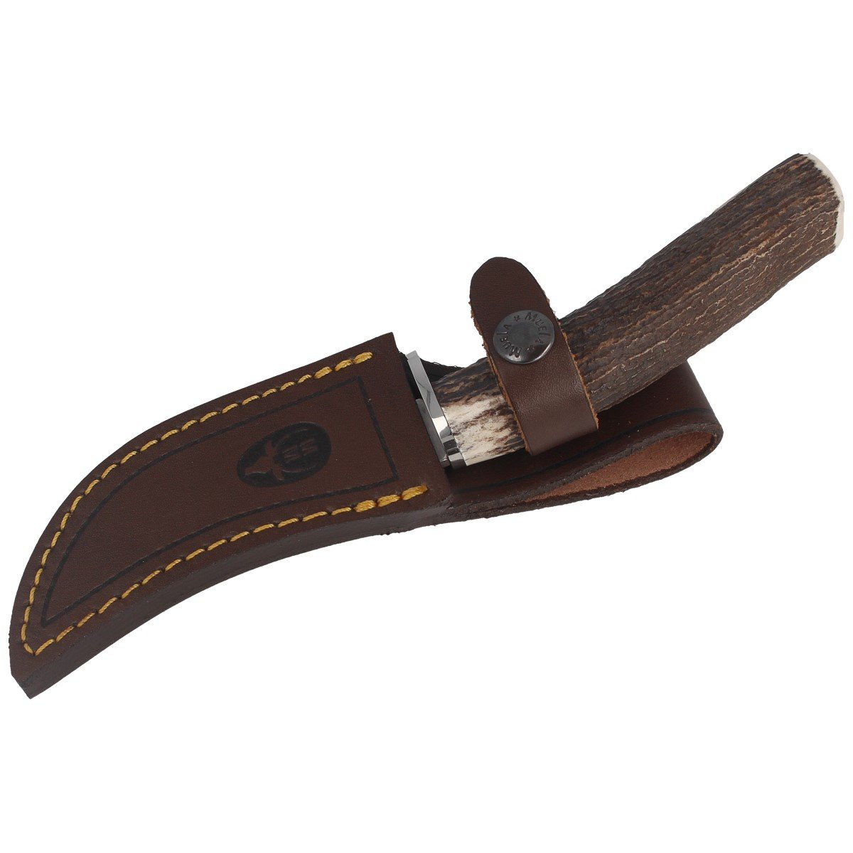 • DP-10A - classic hunting knife for pelting with a fixed blade works well as a fin. Blade molybdenum-vanadium steel. Blade with non-reflective Satin Finish coating with Trailing Point profile. Handle natural deer antler. Leather case.