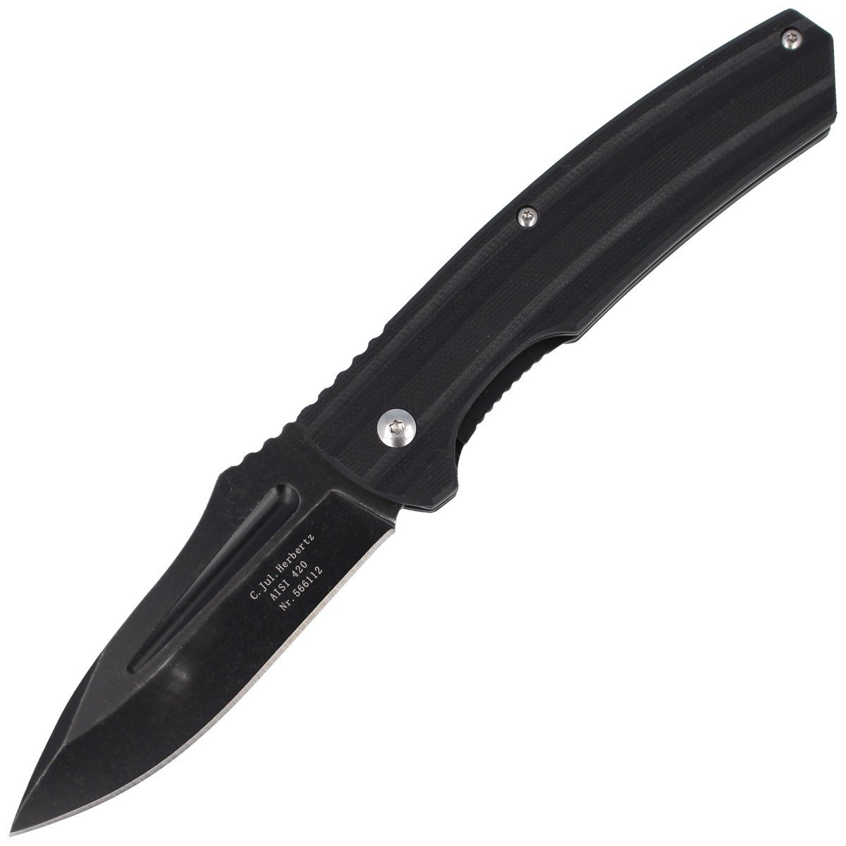 - 566112 A well-balanced, solid and durable folder from Herbertz Solingen. Works in all conditions, as EDC and during trips out of town. Blade with a Drop Point profile made of 420 steel. G-10 handle linings. Tip-down clip.