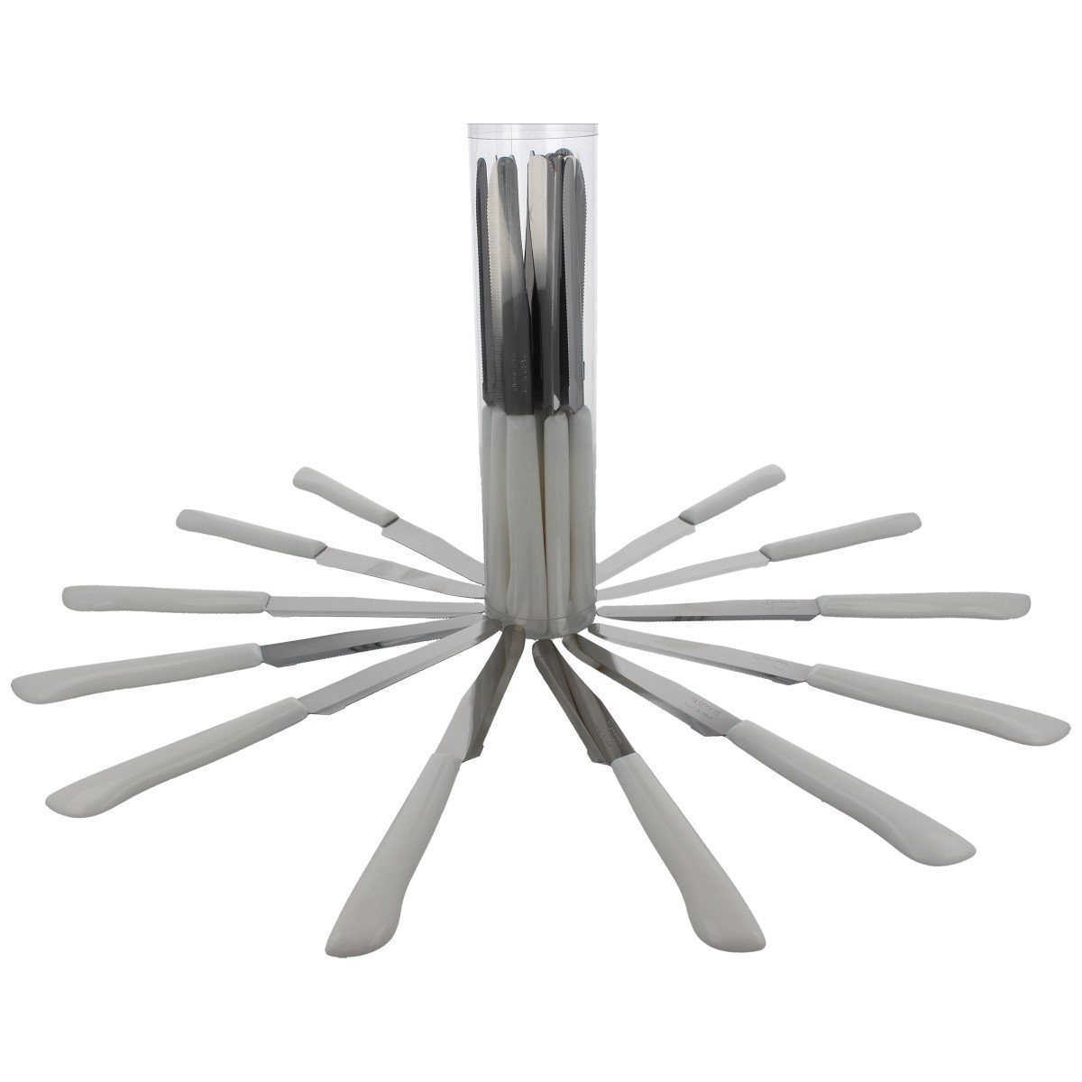 PV 208 TUBO-12 / WH (White) - a 12-piece set of universal serrated kitchen knives from the Italian brand DOI LEONS at a great price! The Arlecchini series is a collection designed for everyday use. The sharp-edged blades necessary in every kitchen make all kitchen work easier. They work well as table knives, breakfast knives and picnic knives. Made in Italy.