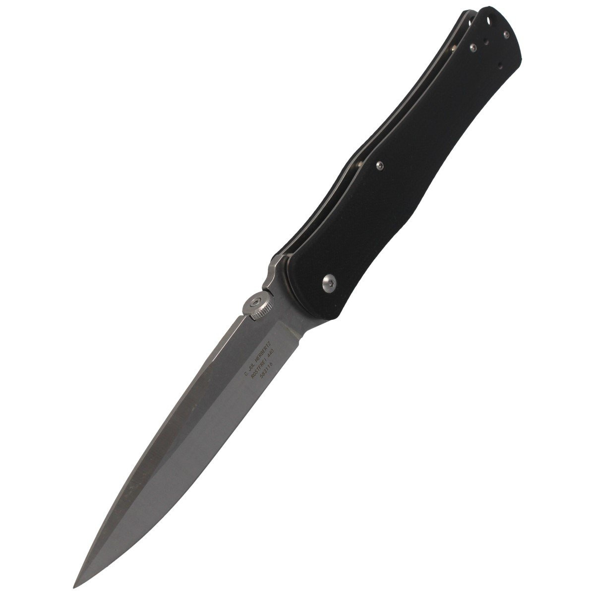 • Herbertz Solingen 583116, a large folding knife manufactured by Herbertz. Long, slender 440A stainless steel blade. Ergonomic G10 composite handle. Tactical character and sturdy construction will satisfy any military enthusiast.