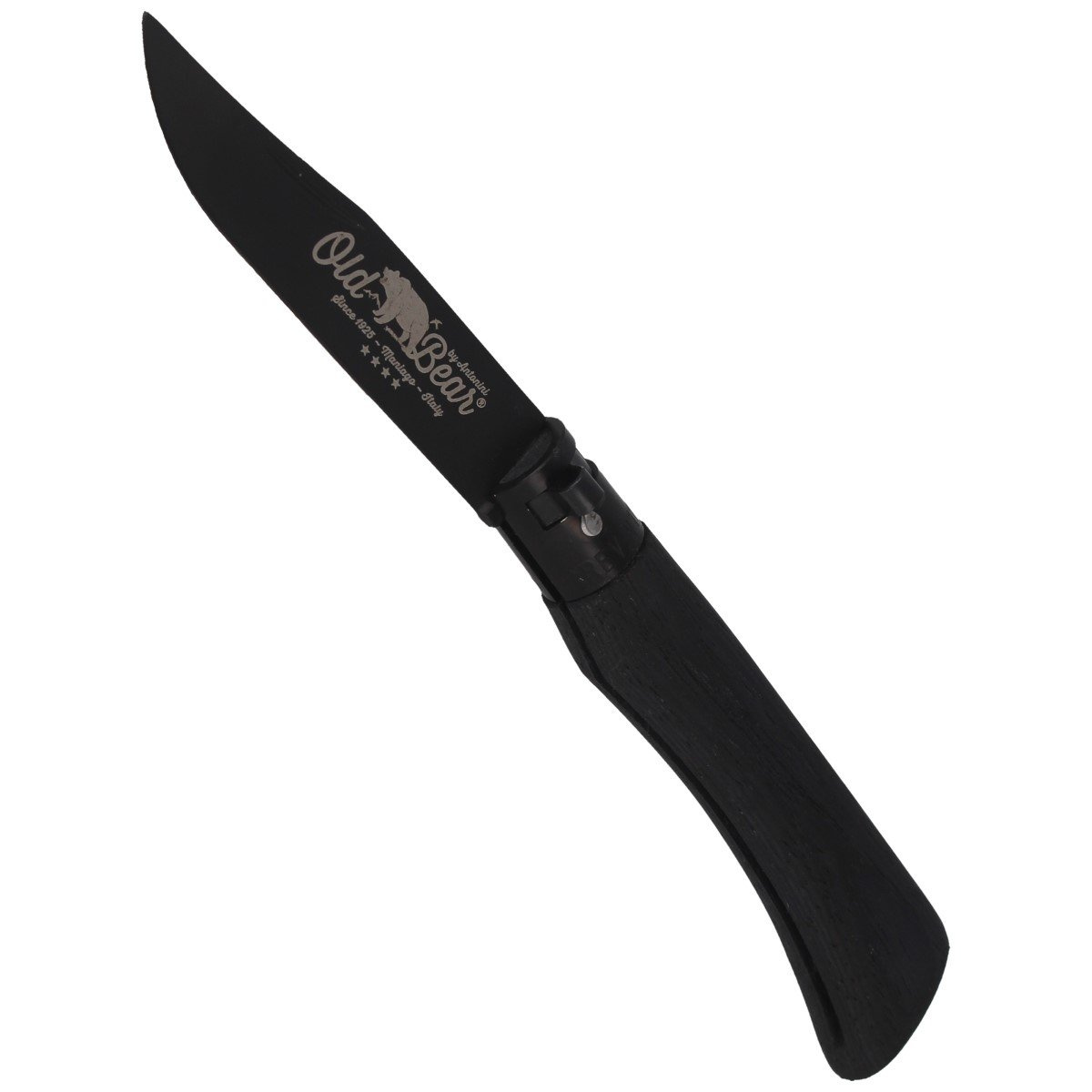 • Old Bear M Total Black, Aluminum Collar luxury knife with ergonomic lines and a distinctive locking blade. Manufactured and assembled by skilled craftsmen. Handle made of one piece of laminated wood in black color. Classic!