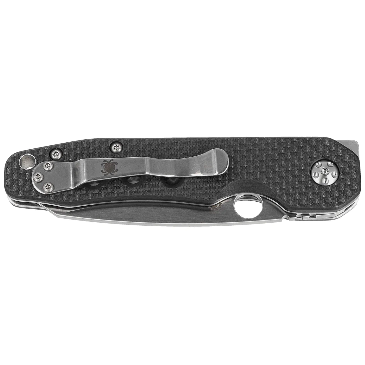 Handle - laminated claddings made of textured carbon fiber / G-10. G-10 material - resistant to high and low temperatures, chemicals) provides a comfortable grip, ergonomic streamlined shape and exclusive texture. The cut in one of the cladding guarantees intuitive access to the SpyderHole cutout. The metal one-position clip (right-handed) allows you to carry the knife in the tip-up position. In the rear part of the linings was placed a gap (lanyard hole) enabling fixing the rope.