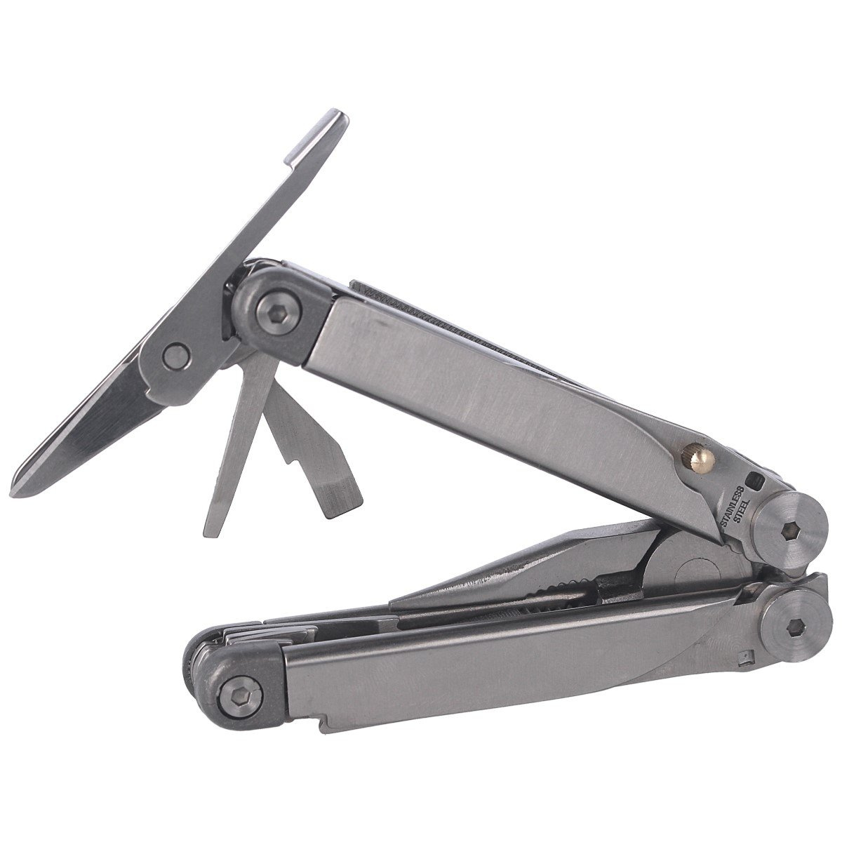 It has ten different functions, such as pliers, a bottle opener and a knife. A black nylon case is added to the device.