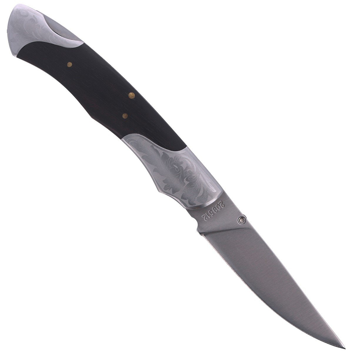 An artful classic from the German brand Herbertz Solingen. Targeted at discerning consumers, made of the best materials. Blade made of 420 steel, handle facings made of natural wood, bolsters made of stainless steel with laser-engraved floral motifs.