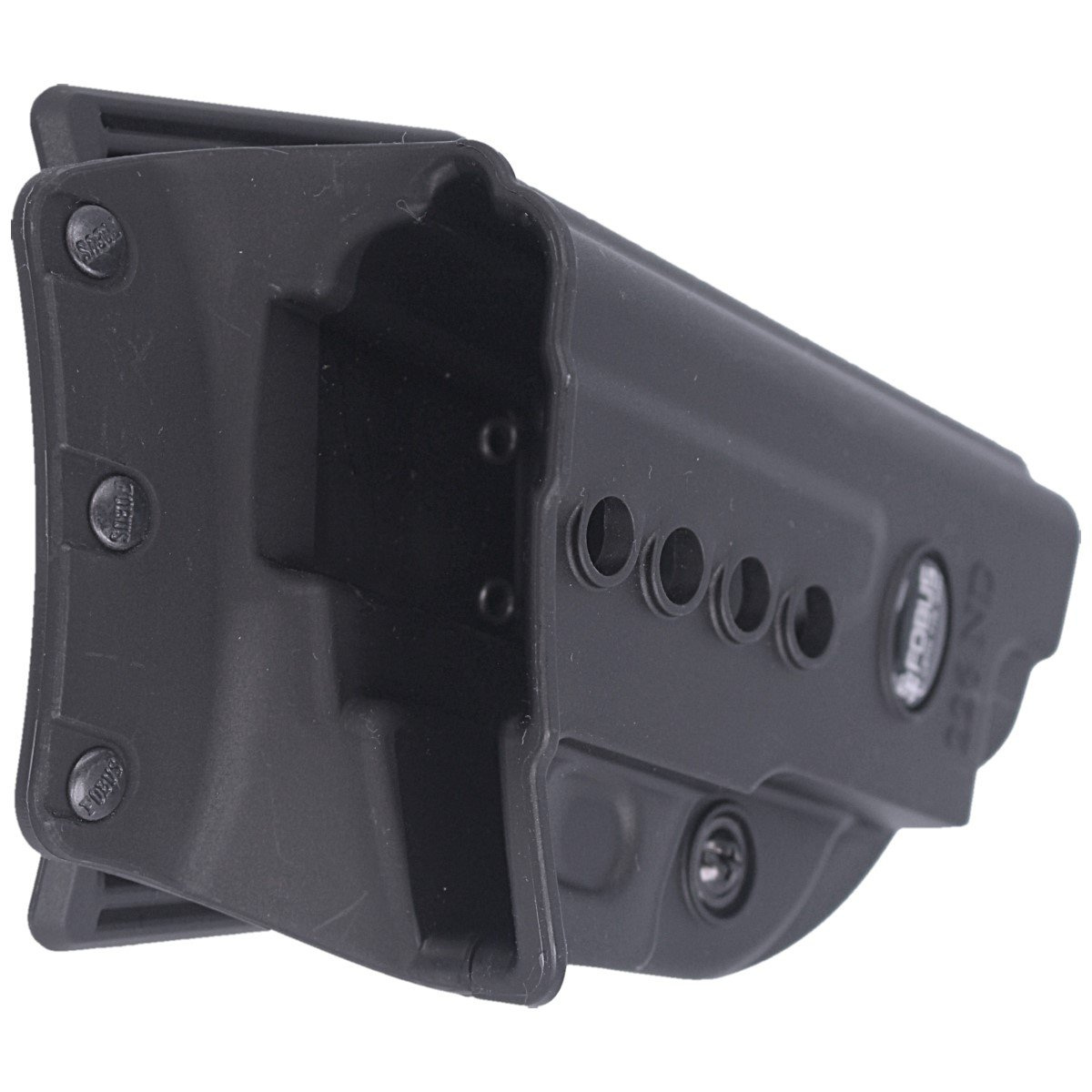 Type of holster - ND / Evolution-2 (New Design / E2 Series) - new generation of holsters Fobus. Made of one piece of plastic, it is lightweight despite the extra features. Includes an additional strip of metal to reinforce the rivets attaching the holster to the flipper which improves its strength and reliability. Weight reduction was achieved by using several holes on the surface of the holster. Series holsters ND / E2 have an additional screw at the holster to allow individual adjustment of the holster's tightness. The adjustment affects the force with which the weapon is held in the holster and the force with which it is removed from the holster. Low profile makes it easier to conceal the weapon, increasing the comfort of carrying it. The holster protects the weapon well from damage, does not tend to move. Available for rightmanual.