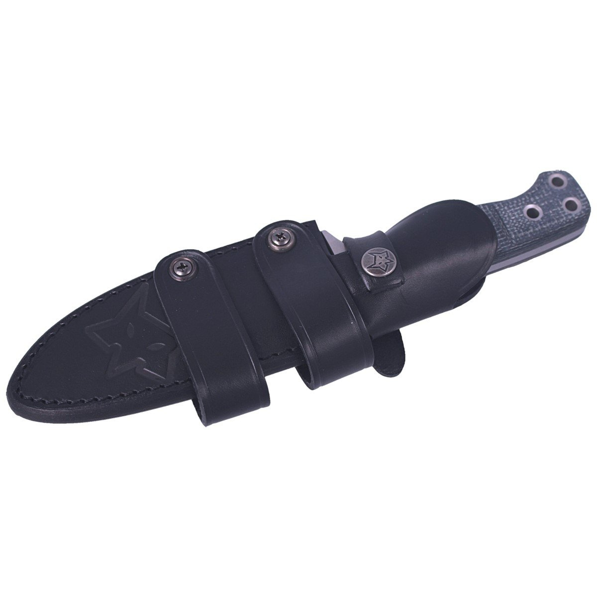 Sheath - extended, protects the blade along with part of the handle. Made of black leather with embossed manufacturer logo. The scabbard is fastened with Prym type buckle. Attached to the belt or to the equipment allows to carry the knife in vertical or horizontal position.