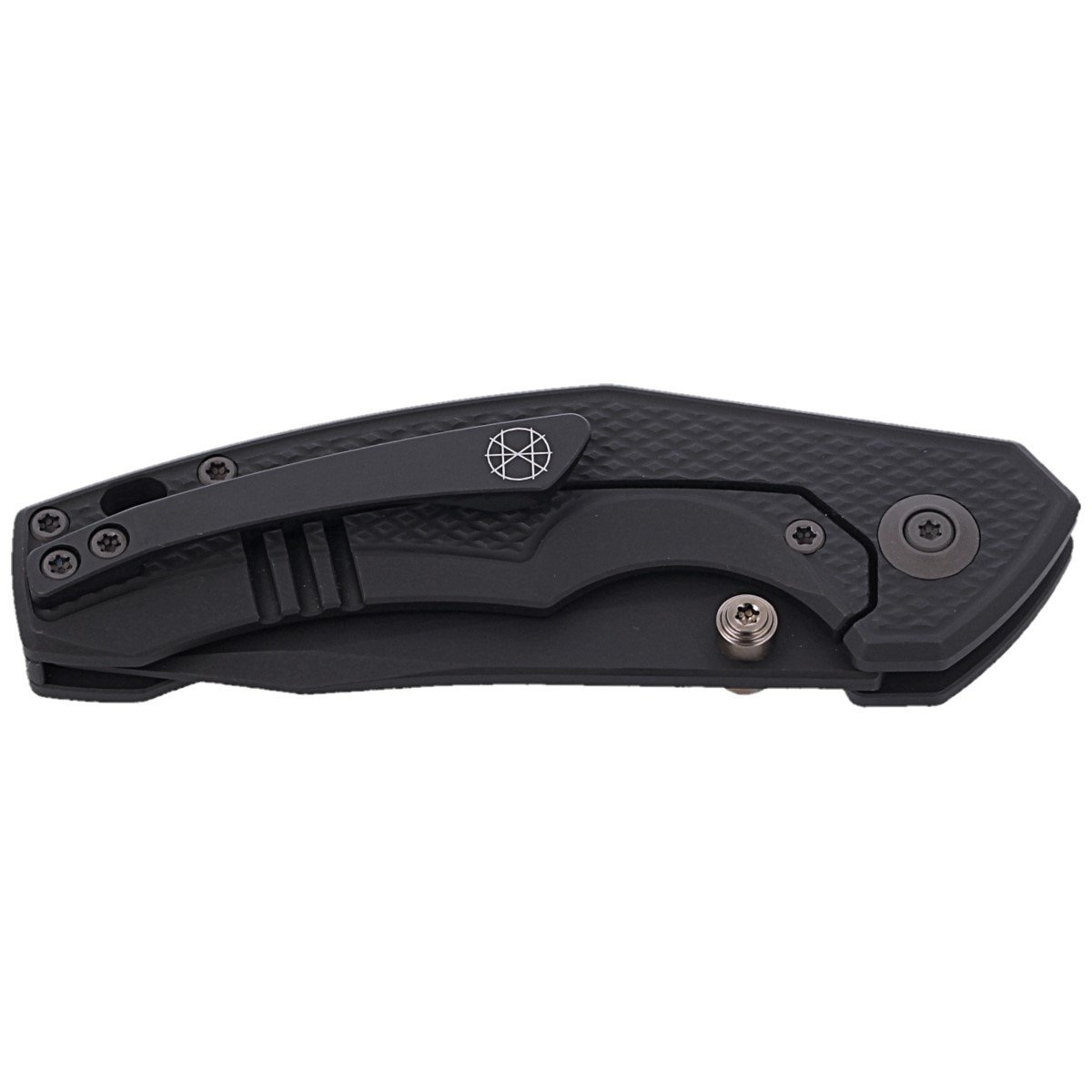 Handle - made of thick, textured titanium pieces for better grip, they were screwed to a titanium backspacer. The whole was patinated to make it look like old bronze. The simplicity and solidity of the construction give the assurance of many years of use. One-position clip (right side) made of one piece of titanium patinated to the color of the handle, allows you to carry the knife in tip-up position. Above the clip there is a lanyard hole for attaching a safety or decorative cord. As in other models, the pivot is decorated with a stylized logo of the manufacturer.