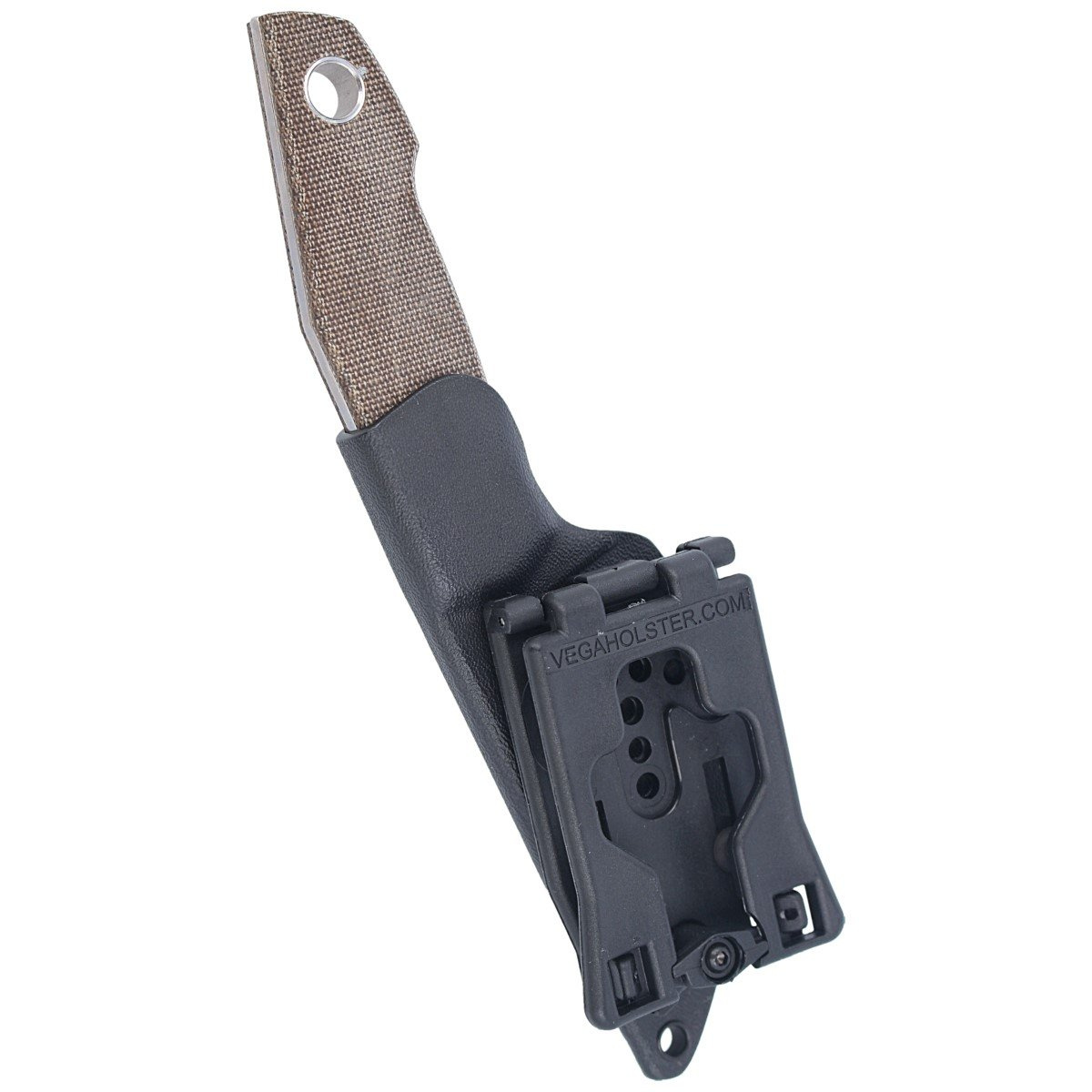 Vega Holster company. Light, made of black Kydex plastic with a multi-position Tek-Lok fastening. Facilitates discreet carrying and quick knife selection.