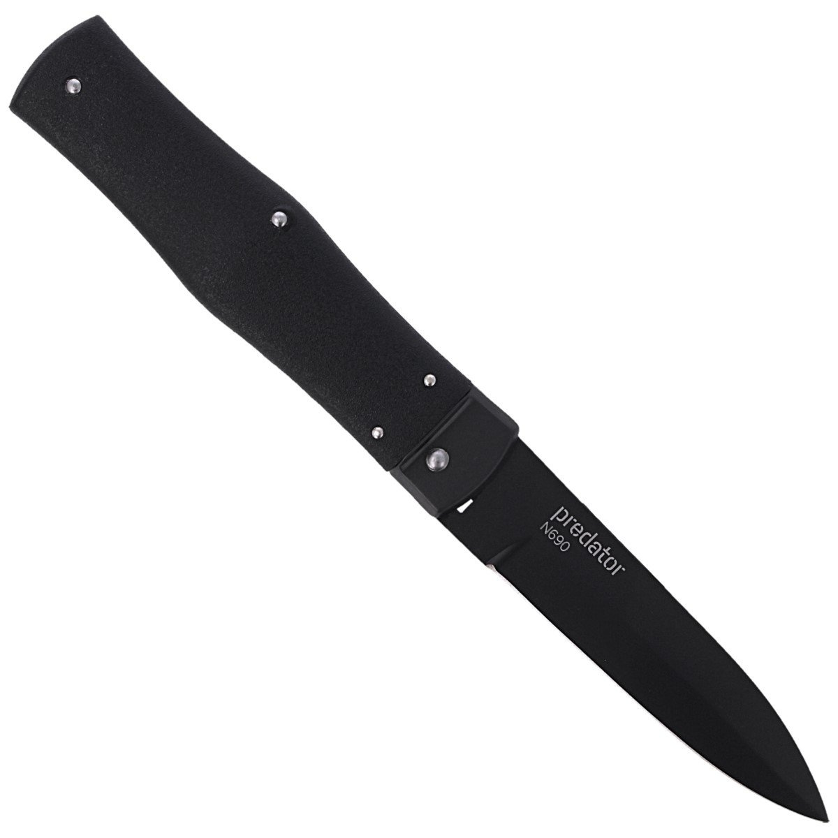 - Predator Blackout Black ABS, DLC, Mikov automatic spring knife with black DLC blade made of N690 steel. Solid construction, two strong opening springs, characteristic click when opening distinguish Predator from other spring knives. Leather case