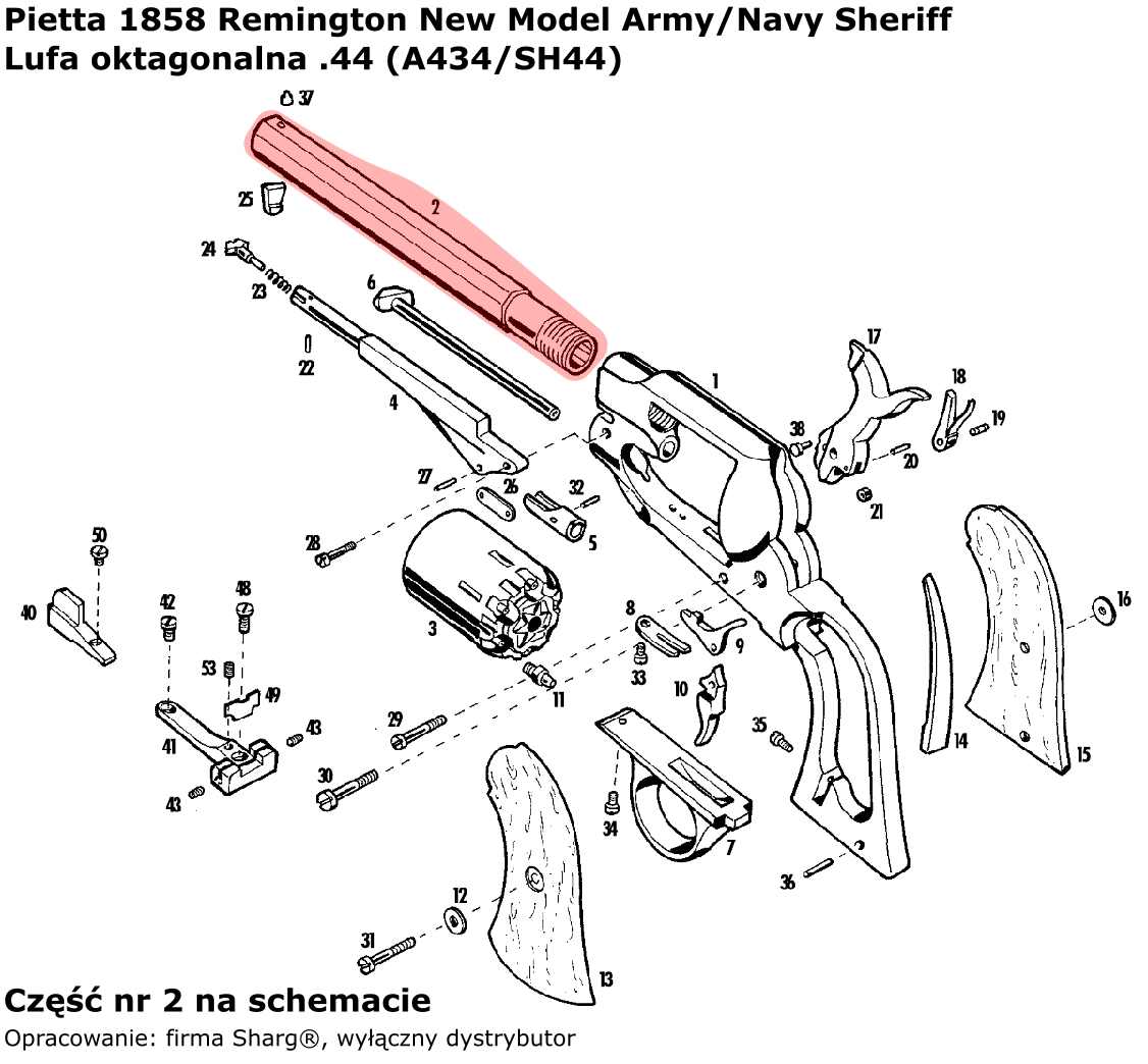 • A434 / SH44 (service) .44 threaded barrel for the 1858 Remington New Model Army / Navy Sheriff black powder revolver by Pietta. 5.5 inch octagonal, black oxidised.