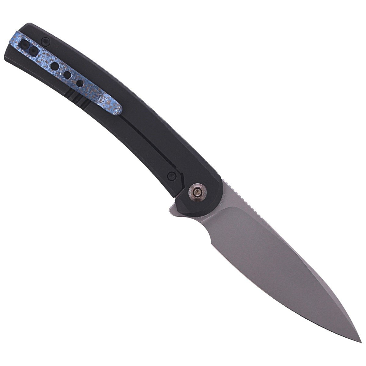 Handle - made of thick pieces of titanium, finished in black colour, connected with each other by titanium spacer sleeves. The simplicity and robustness of the construction ensure many years of use. A two-position (left/right) deep carry clip, made of hammered and colour-anodised titanium, allows the knife to be carried in tip-up position. One of the sleeves serves as a pendant to thread a safety or decorative cord. As in other models, the pivot is decorated with a stylised manufacturer's logo.
