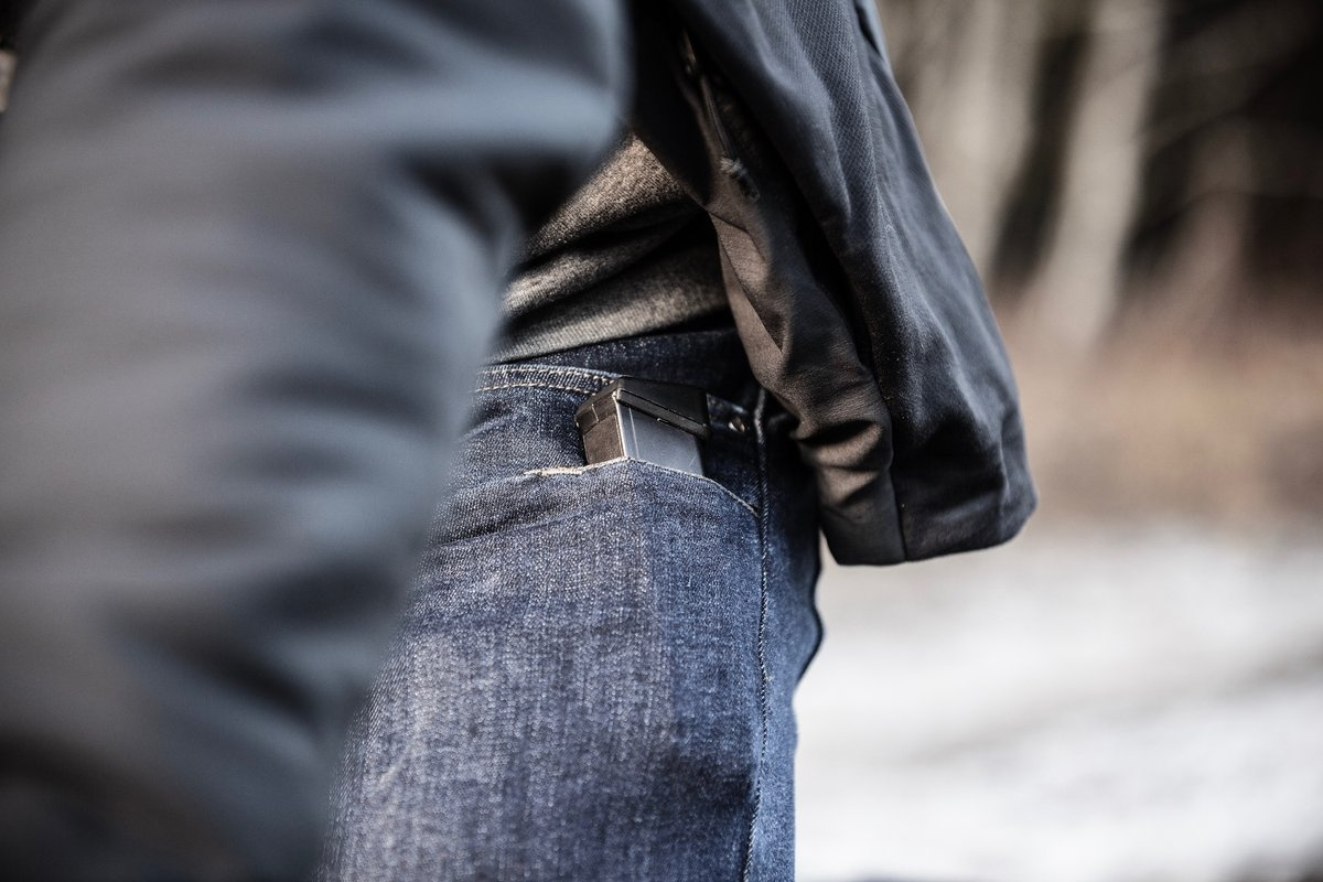 141,21 €M.U.D. Blue Denim Version 2.0. Multi Utility Denim functional tactical denim pants with a unique cut by LMSGear. Made of high quality indigo blue denim fabric. Designed to carry EDC equipment in a convenient and discreet way. Design adapted to the requirements for the concealed carrying of firearms and accessories. The manufacturer's logo is three Roman nails crossed.