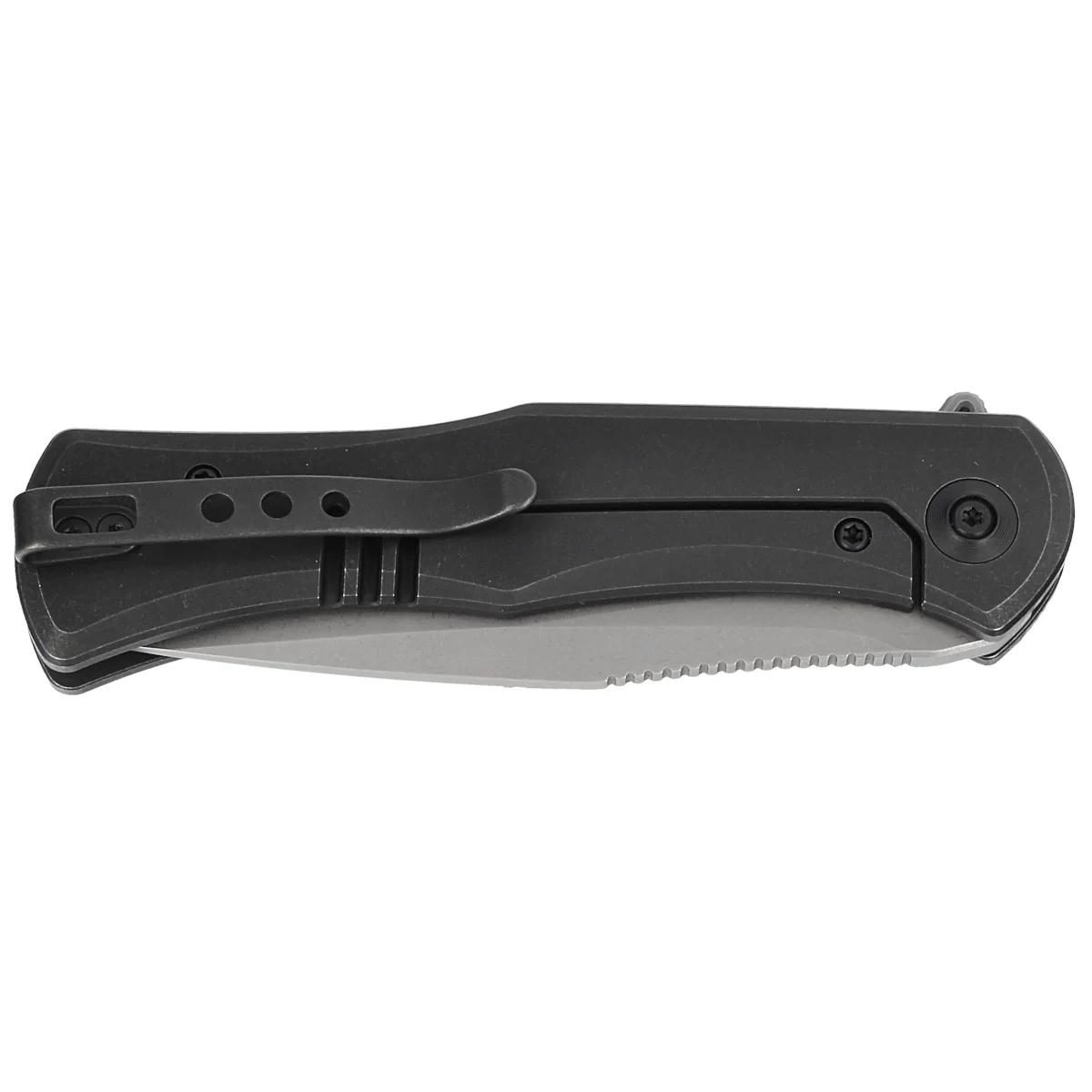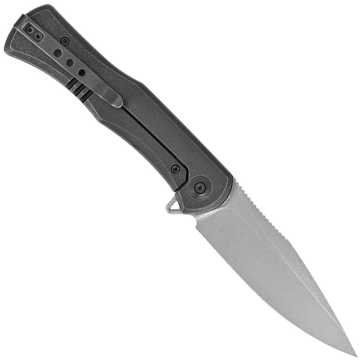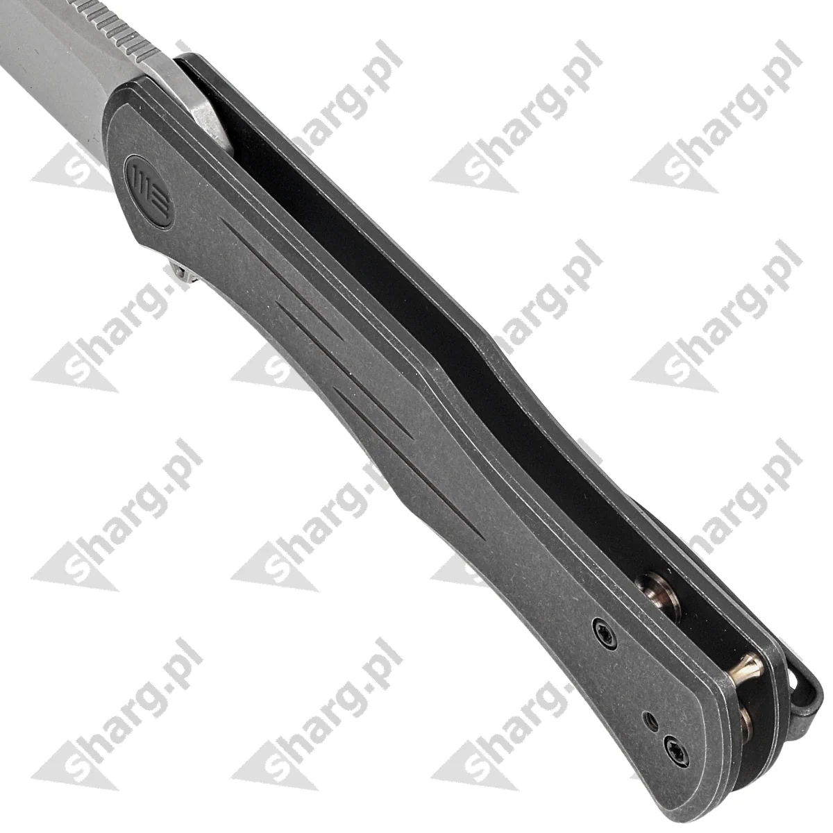 Handle - made of solid titanium 6AL4V finished in black color. Both grips are bolted together using spacers creating a simple and robust construction. A two-position (right/left) deep carry clip, made of titanium, allows you to carry the knife in tip-up position. The back of the handle has a place to thread a safety or decorative cord around one of the spacer sleeves. As in other models, the pivot is decorated with a stylized logo of the manufacturer.