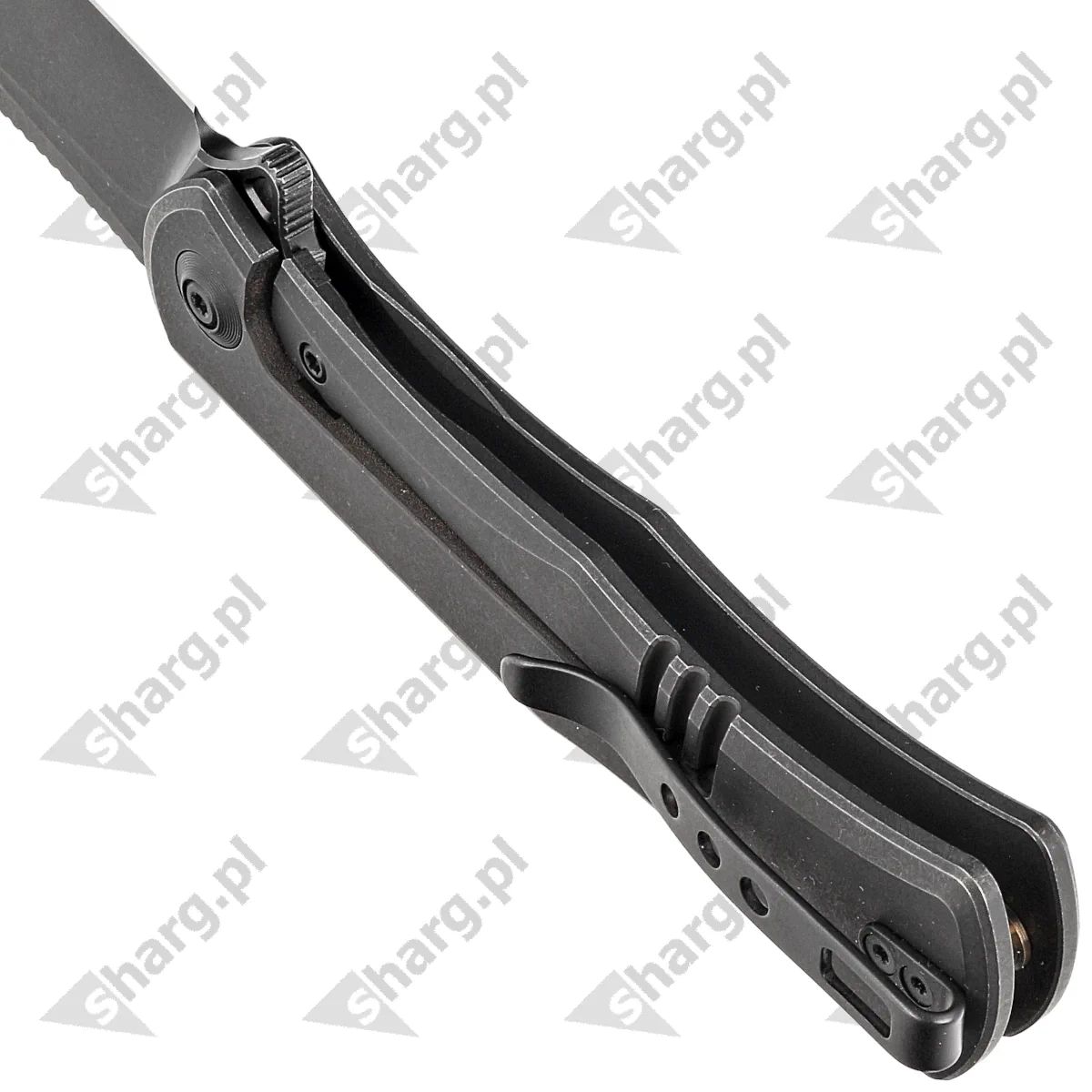 Handle - made of solid titanium 6AL4V finished in black color. Both grips are bolted together using spacers creating a simple and robust construction. A two-position (right/left) deep carry clip, made of titanium, allows you to carry the knife in tip-up position. The back of the handle has a place to thread a safety or decorative cord around one of the spacer sleeves. As in other models, the pivot is decorated with a stylized logo of the manufacturer.