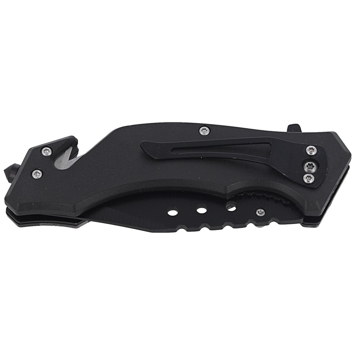 Handle - black plastic facings mounted to a steel frame. Left side decorated with Route 66 graphic motif. Chamfered edges of the covers eliminate sharp edges for comfort and sure grip. A single-position (right/left) metal deep-carry clip allows you to carry the knife discreetly in your pocket in a tip-down position (blade tip down). The back of the handle features a belt cutter and a tungsten-carbide glass breaker.