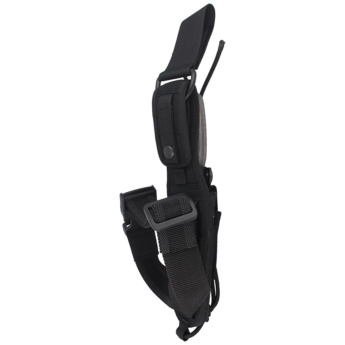 Scabbard - Vega Holster with additional pocket for accessories: sharpener or flint. Made of waterproof Cordura® in black. The holster has a snap fastener which protects the knife from falling out. Allows attachment to M.O.L.L.E. system webbing. (Modular Lightweight Load-carrying Equipment), or on the belt. The lower part of the scabbard with a DuraFlex buckled thigh band with rubber reinforcement prevents the scabbard from moving on the thigh.