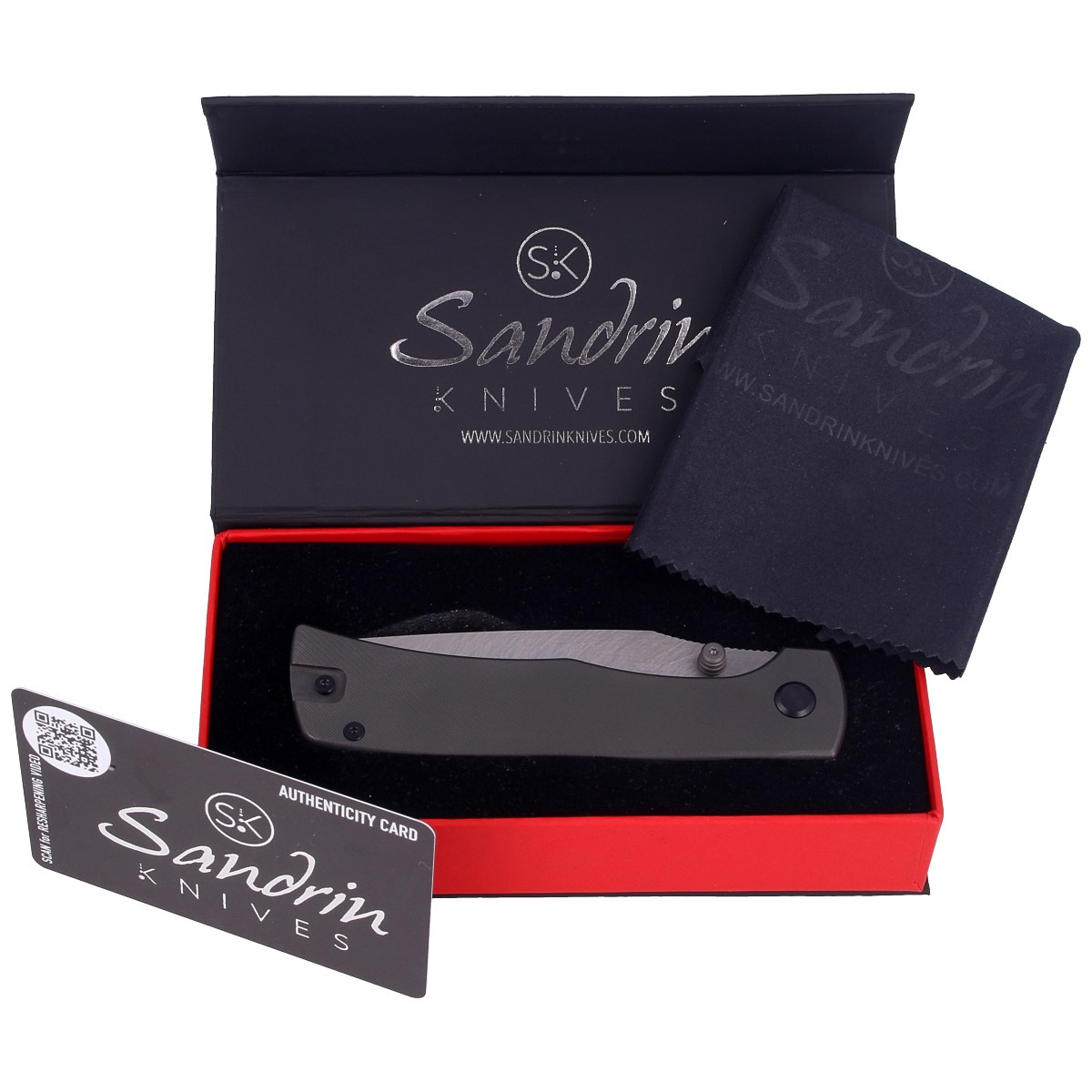 Handle - zirconium linings, a metal with a much higher density than titanium and much rarer in nature. Slightly rough surface of the facings provides more secure grip, additionally the surface was coated with zirconium dioxide, coating extremely resistant to damage. Two-position, left/right PVD coated titanium clip allows you to carry the knife in tip-up position. The clip features a series of mathematically designed 5 circles cut to reflect the Fibonacci sequence - the hallmark of the Sandrin Knives brand.