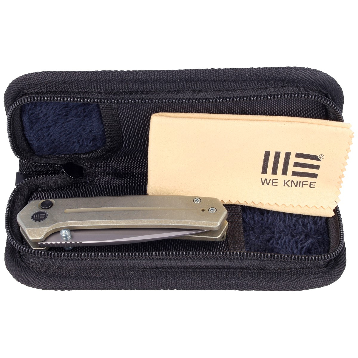 Two pieces of solid titanium 6AL4V in green color. Chamfered cover edges eliminate sharp edges for comfort and improve grip. Open-backed design attached with steel spacer sleeves reduces weight and makes cleaning easier. As in other WE models, the pivot is decorated with a stylized manufacturer's logo. The left/right titanium clip allows you to carry the knife in tip-up position, with the tip of the blade upwards.