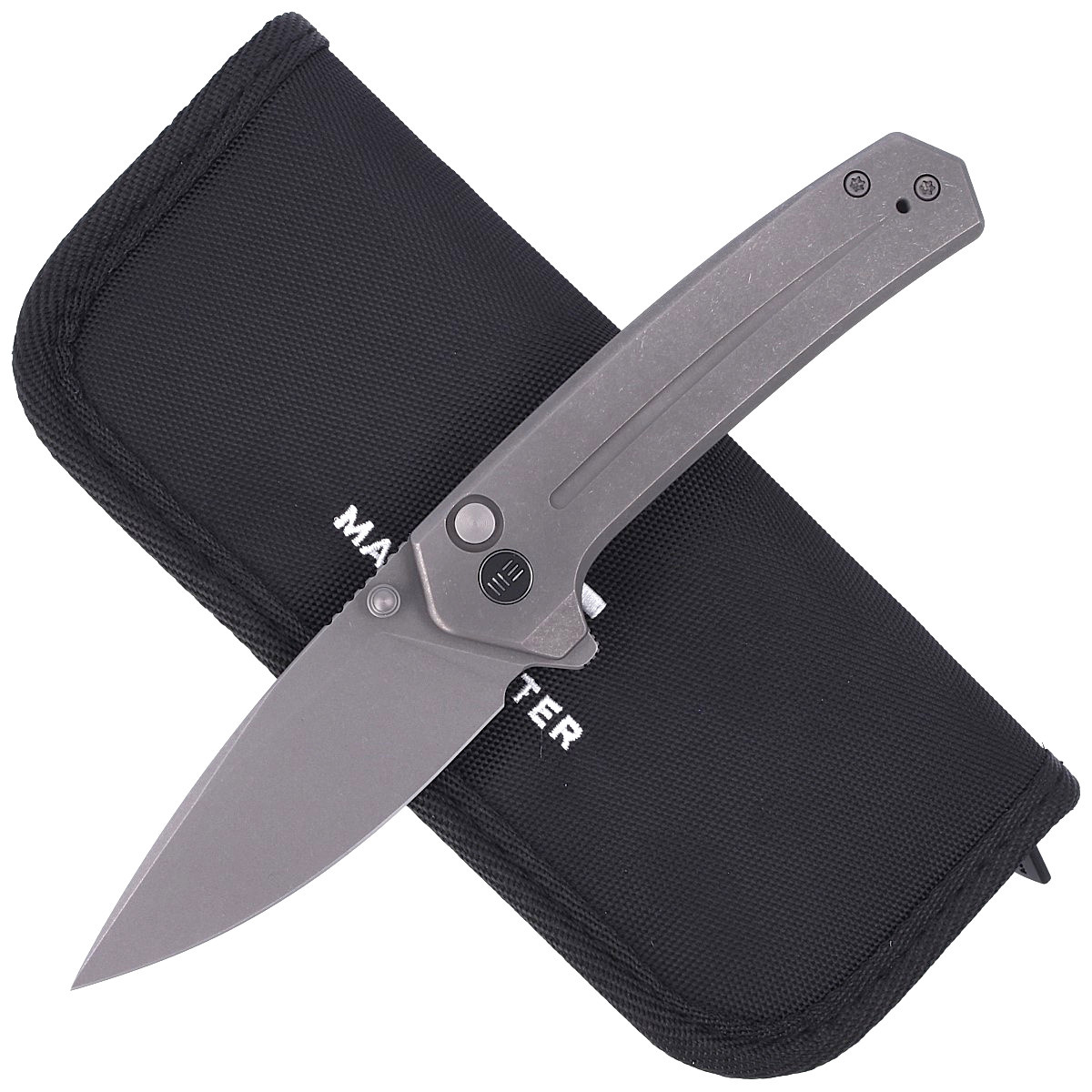 Two pieces of solid titanium 6AL4V in grey color. Chamfered cover edges eliminate sharp edges for comfort and improve grip. Open-backed design attached with steel spacer sleeves reduces weight and makes cleaning easier. As in other WE models, the pivot is decorated with a stylized manufacturer's logo. The left/right titanium clip allows you to carry the knife in tip-up position, with the tip of the blade upwards.