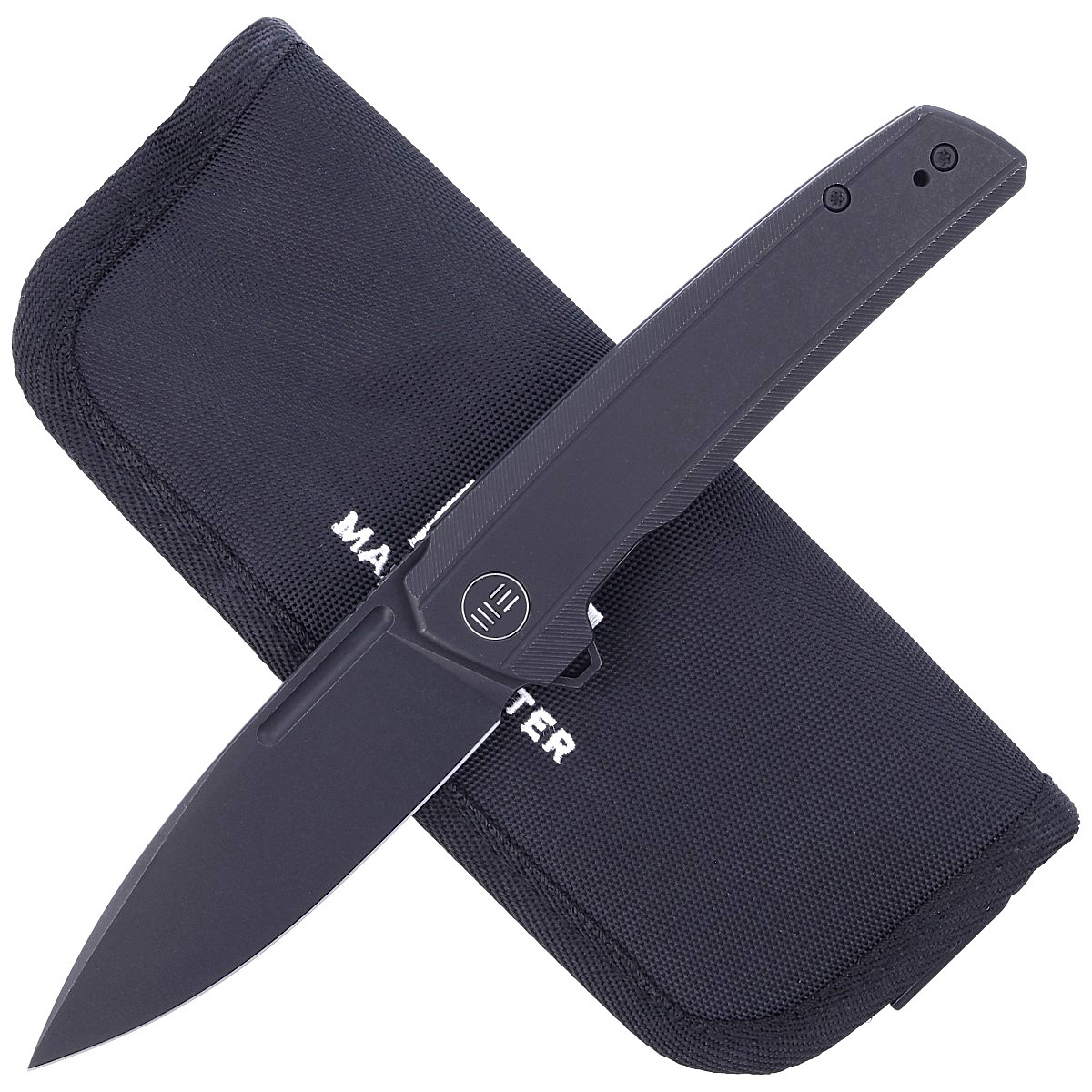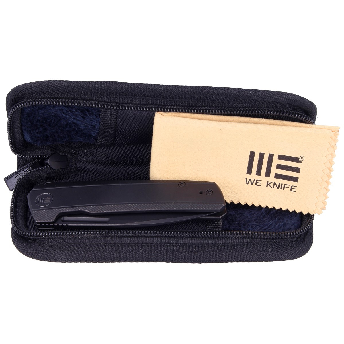 Two pieces of solid titanium 6AL4V in black color. Chamfered edges and fine texture improve grip security. Open-backed construction with titan spacers reduces weight and facilitates cleaning. As in other WE models, the pivot is decorated with a stylized manufacturer's logo. The left/right titanium clip allows you to carry the knife in tip-up position, with the tip of the blade upwards.