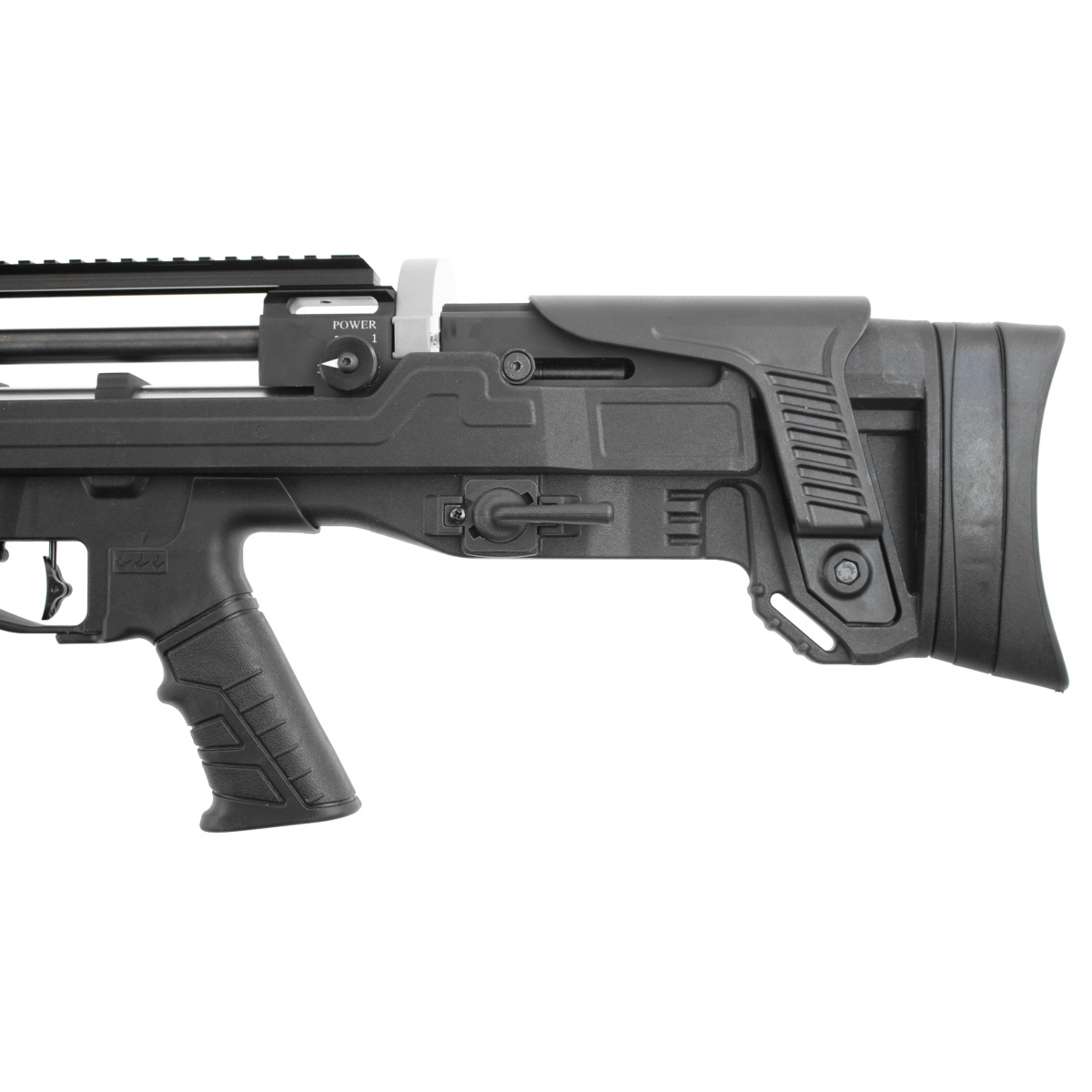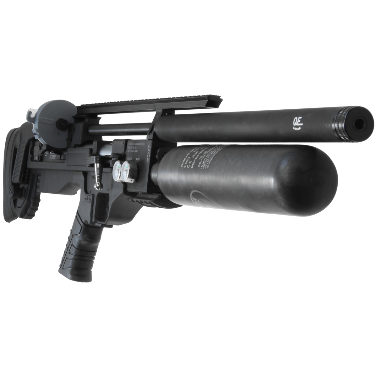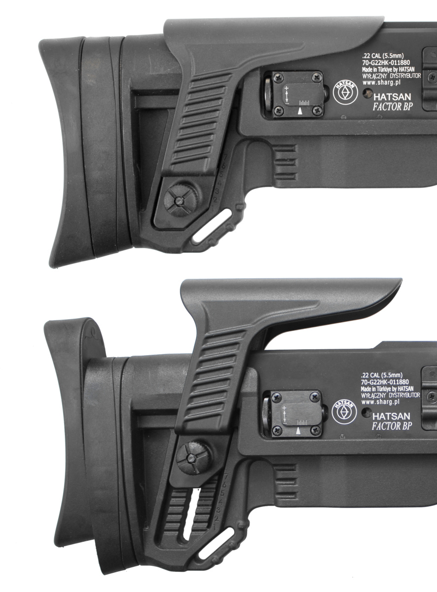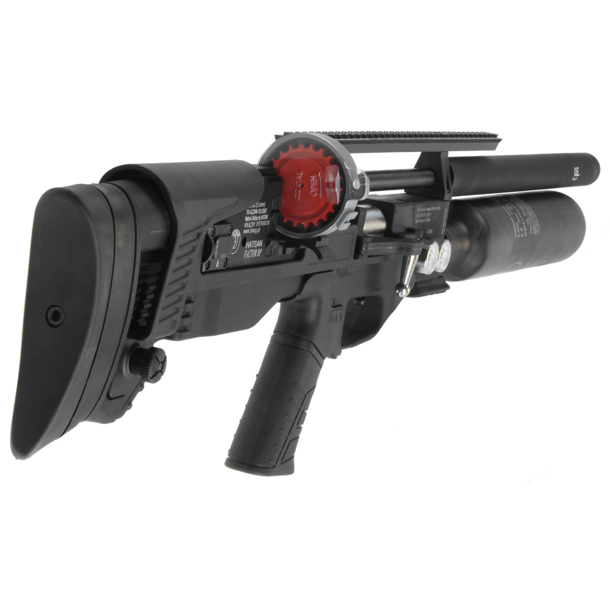 - FACTOR BP PCP rifle in the bullpup version known for its offset chamber and magazine behind the trigger, carbon fiber cartridge, Side Lever reloading lever, firing power regulator, trigger mechanism adjustment knob, barrel with integrated suppressor