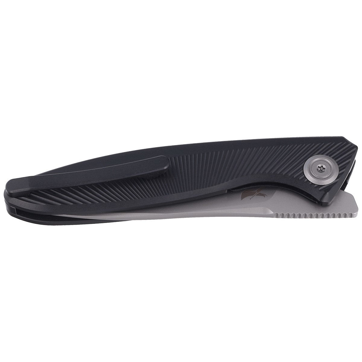 Handle: contoured grips made of solid black anodized titanium 6AL4V, textured for a better grip. The whole is screwed to a solid backspacer, also made of titanium. The simple, solid construction guarantees many years of use. The deep forefinger groove improves grip. The single position (right) titanium deep carry clip allows the knife to be carried discreetly in the pocket in a tip-up position (with the tip of the blade up).